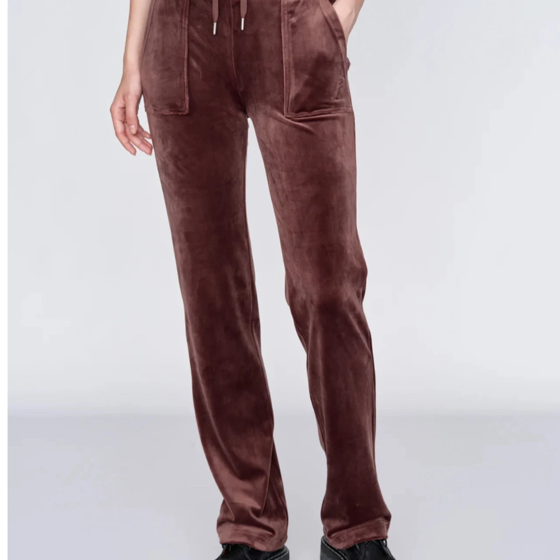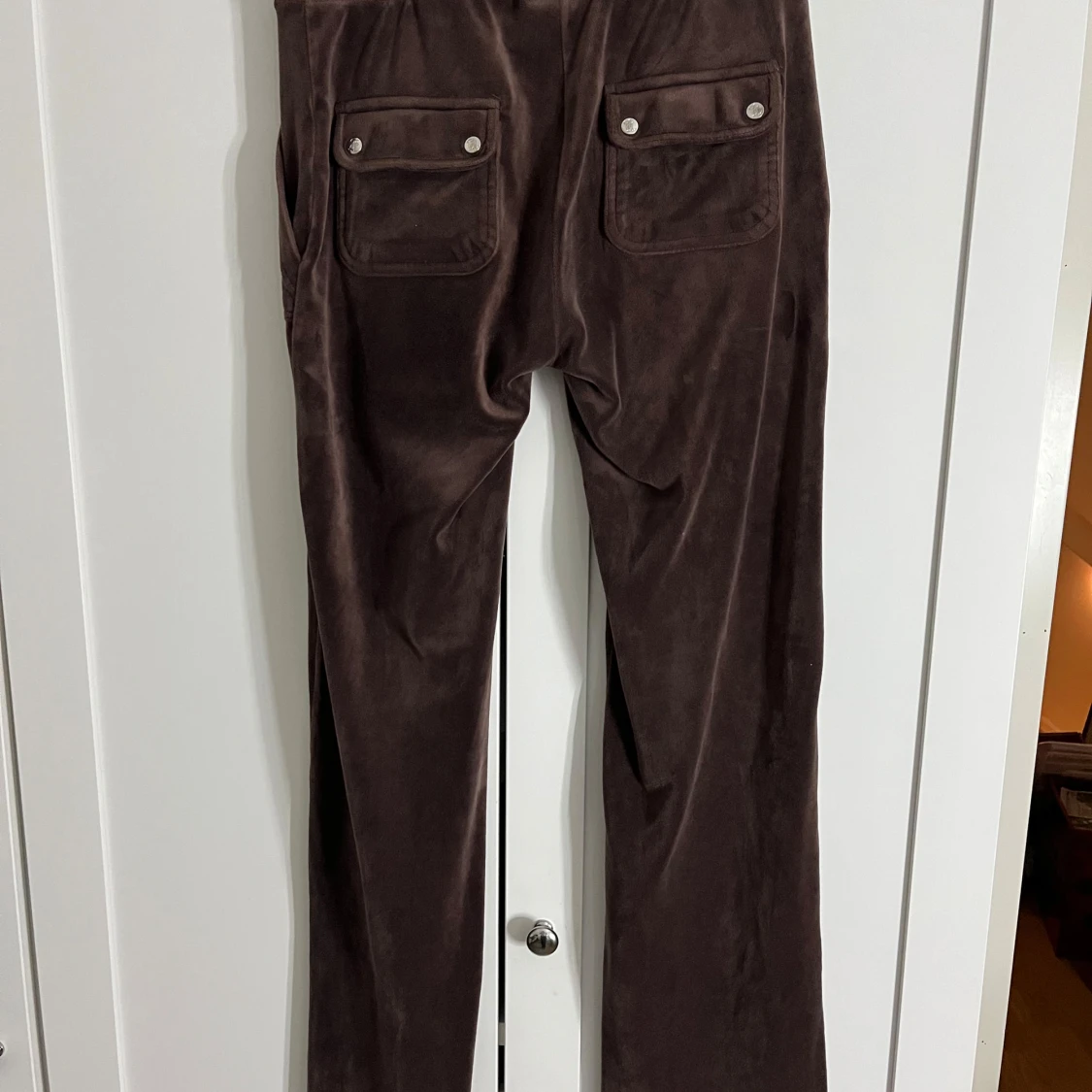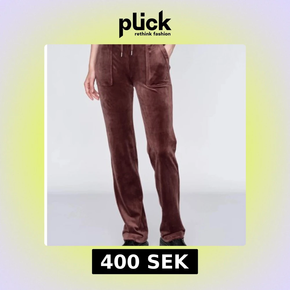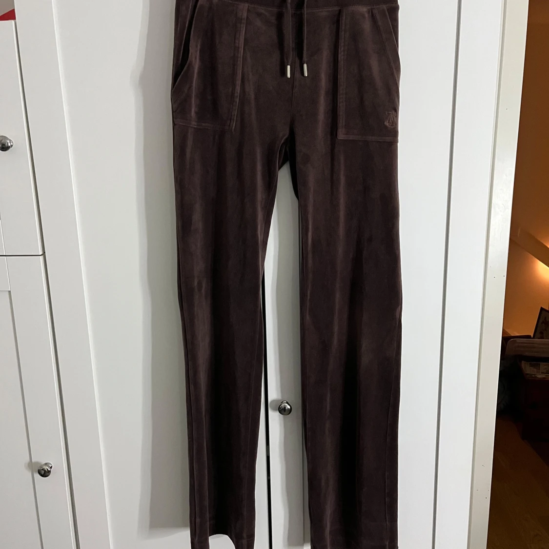 Mysiga bruna mjukisbyxor i mjukt material med raka ben och snörning i midjan. Byxorna har fickor fram och bak, samt dekorativa knappar på bakfickorna. Perfekta för en avslappnad stil. Inga hål, det finns även med matchade tröja bild kan skickas