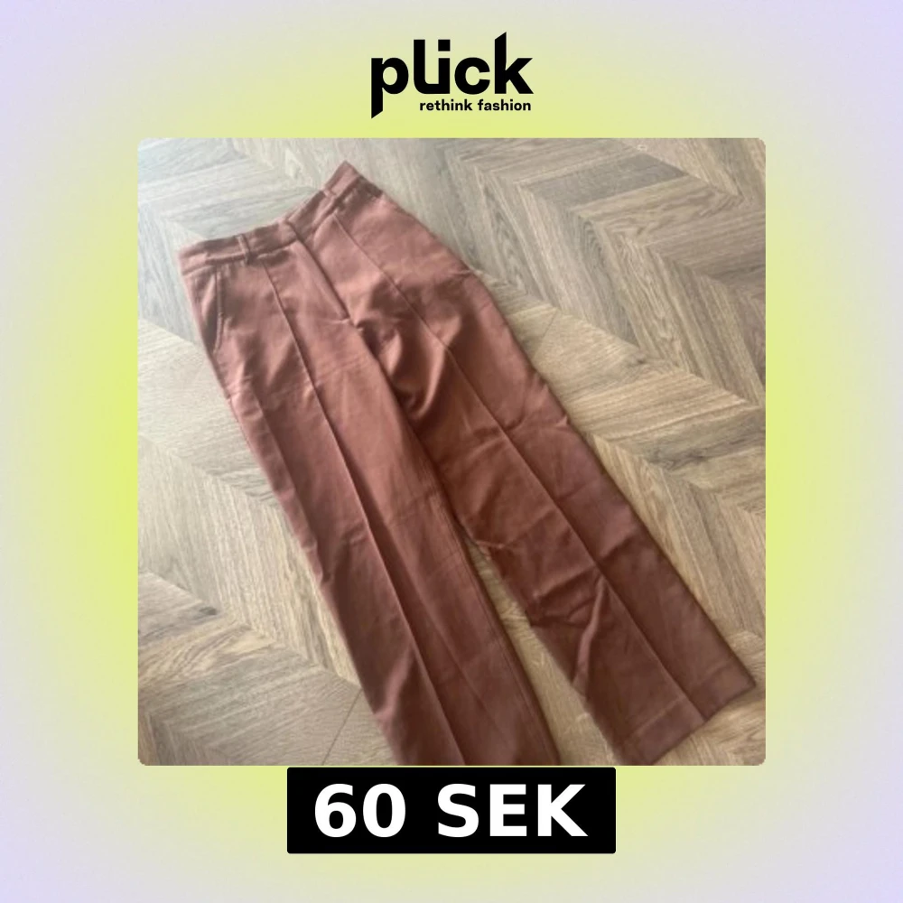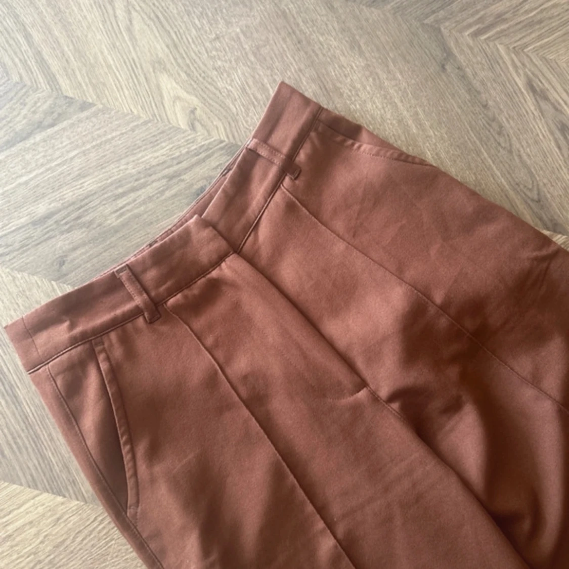 Snygga bruna kostymbyxor med hög midja och raka ben. Perfekta för en stilren look. Byxorna har diskreta fickor och en klassisk design. MADLADY 34/short