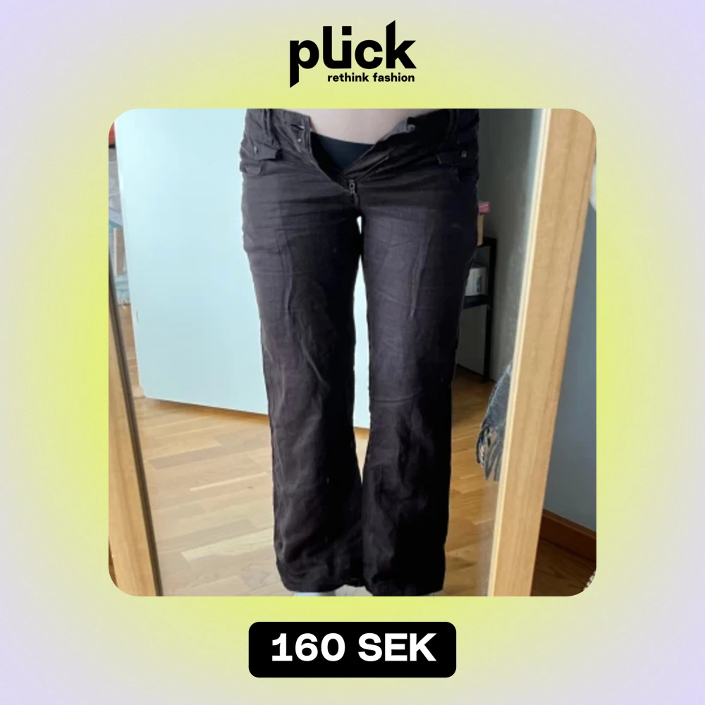 Lågmidjade! En knapp saknas (andra bilden) och de är omsydda långst ner på benen, men annars i bra skick! Midja: 38cm Ytterben: 94 cm Innerben: 74cm