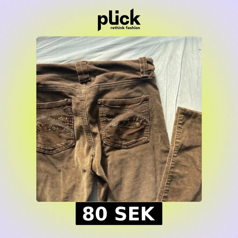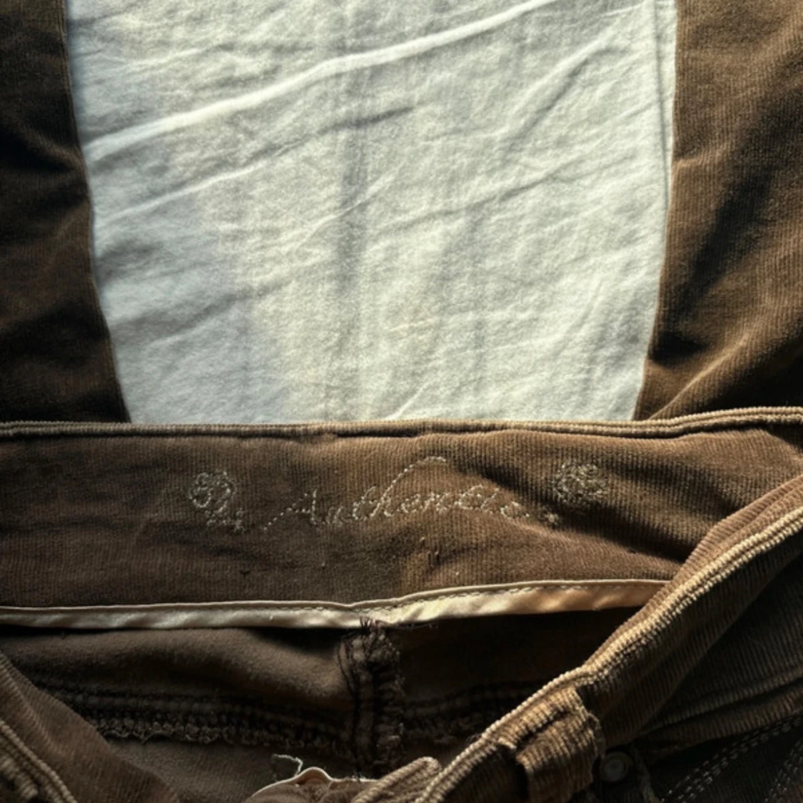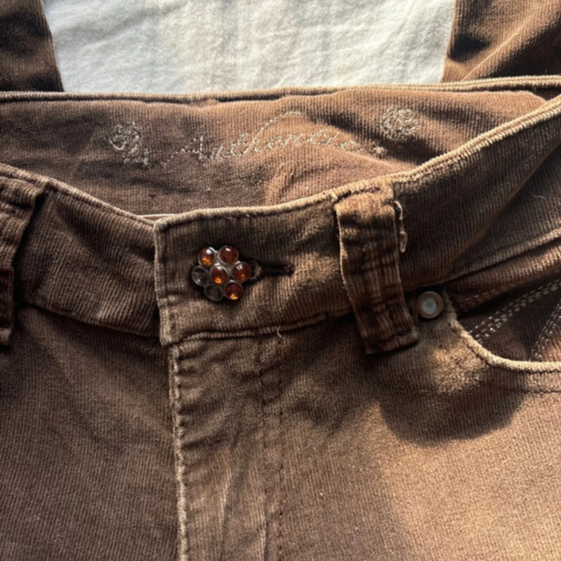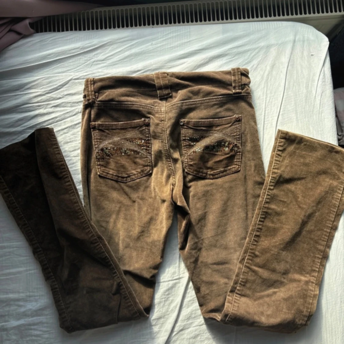 Bruna manchesterbyxor från Authentic med snygga strassdetaljer på bakfickorna och en unik knapp framtill med bruna stenar. Byxorna har normal passform och raka ben. Perfekta för dig som vill ha något extra i din outfit. Byxorna är INTE skinny utan raka, alltså raka ben. Byxorna saknar några stenar på framsidan och på fickan, men det är inget som stör funktionen och looken av de