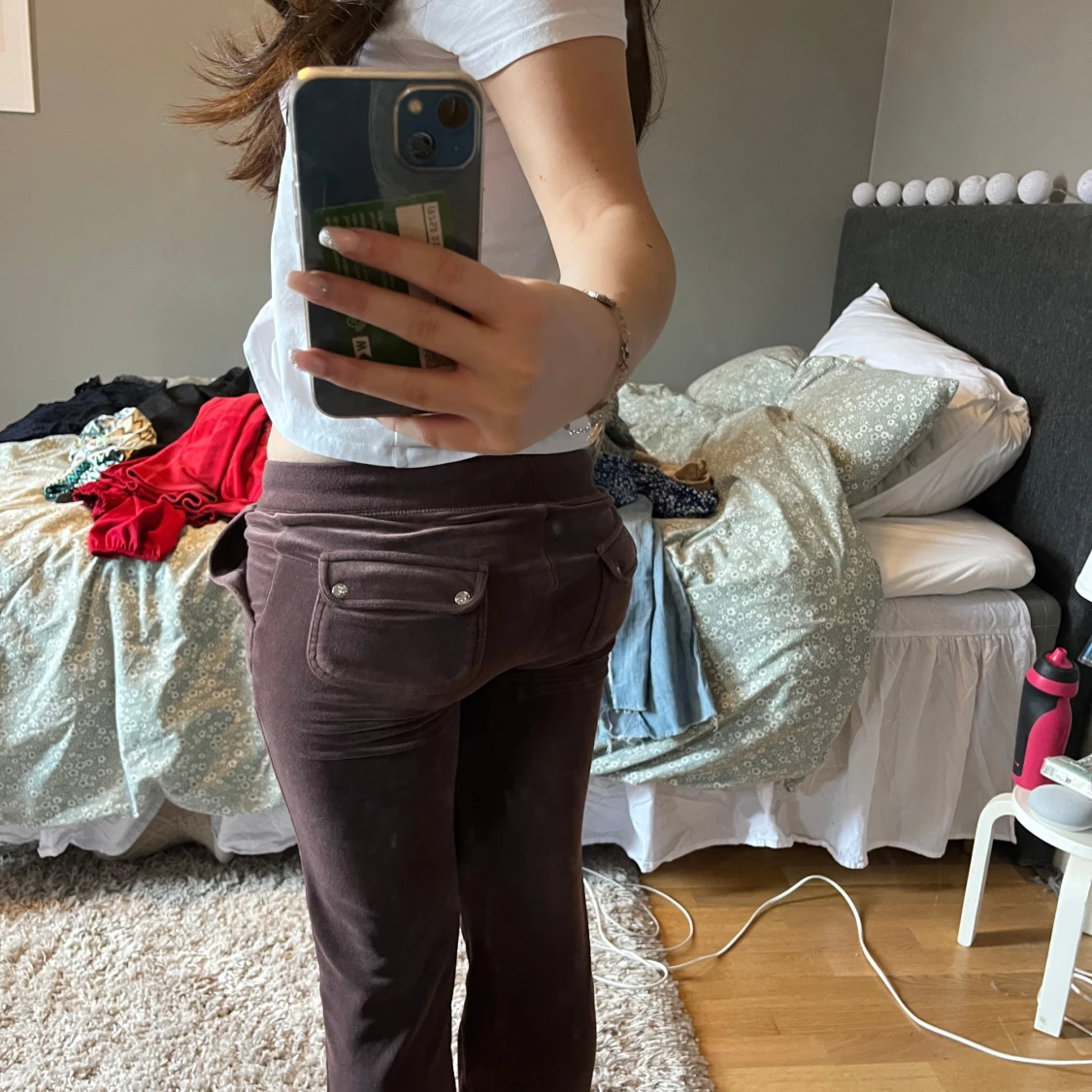 Säljer ett par bruna mjukisbyxor från Juicy Couture. Byxorna har en snörning i midjan och bakfickor med knappar. Perfekta för en avslappnad stil.