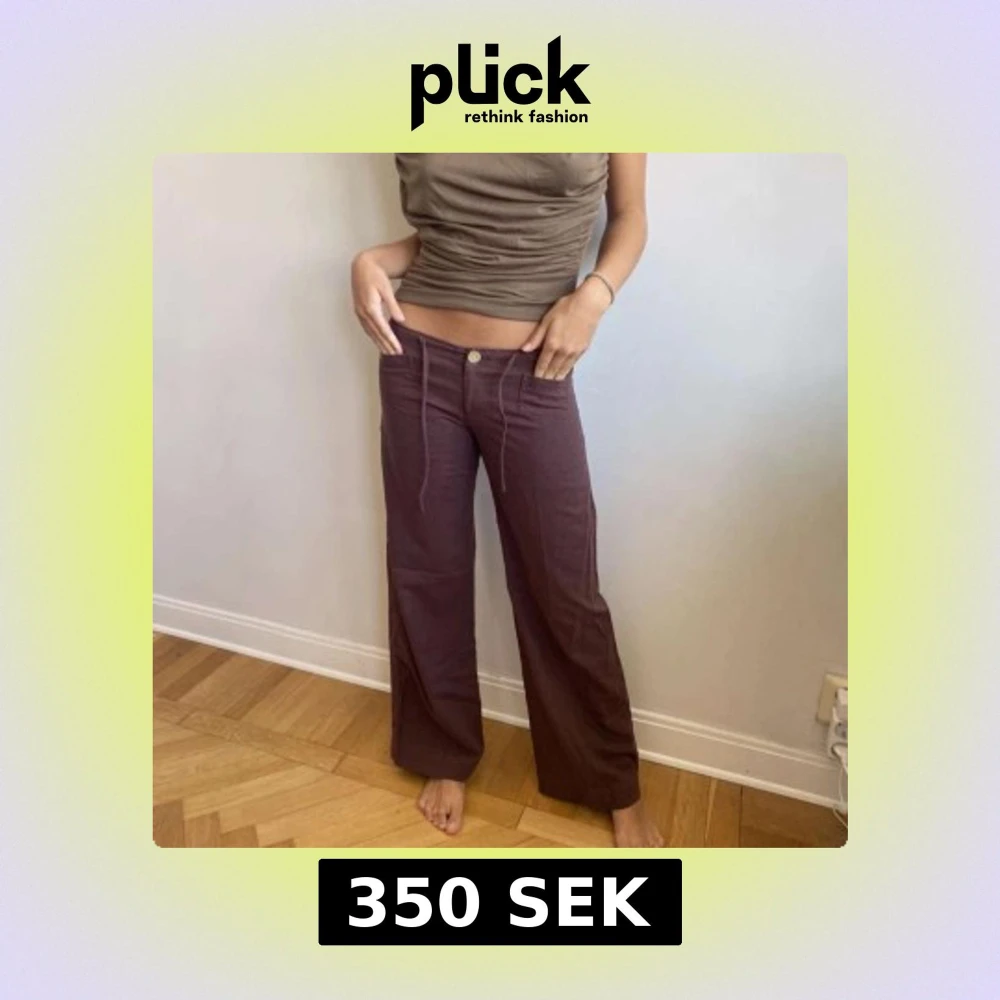 Säljer ett par bruna byxor med vida ben och vita kontrastsömmar. Byxorna har låg midja, knapp och dragkedja framtill samt fickor både fram och bak. Perfekta för en avslappnad och trendig stil.
