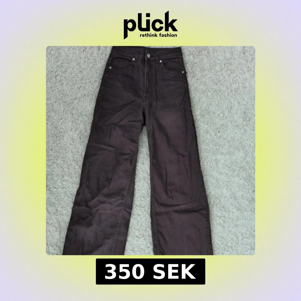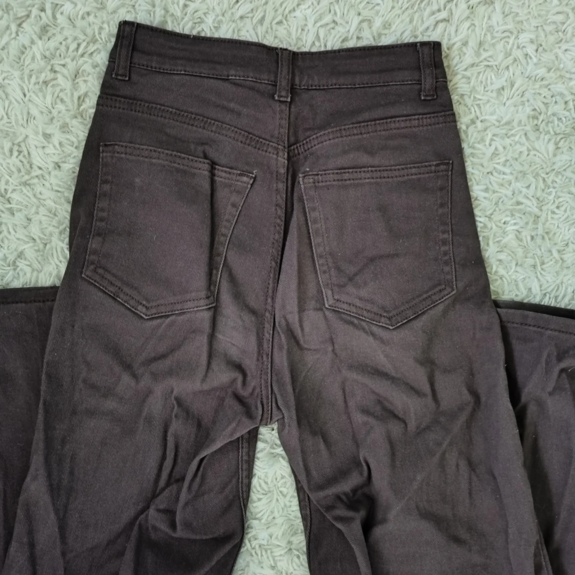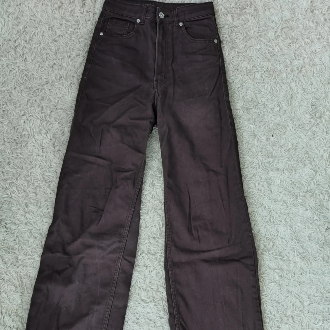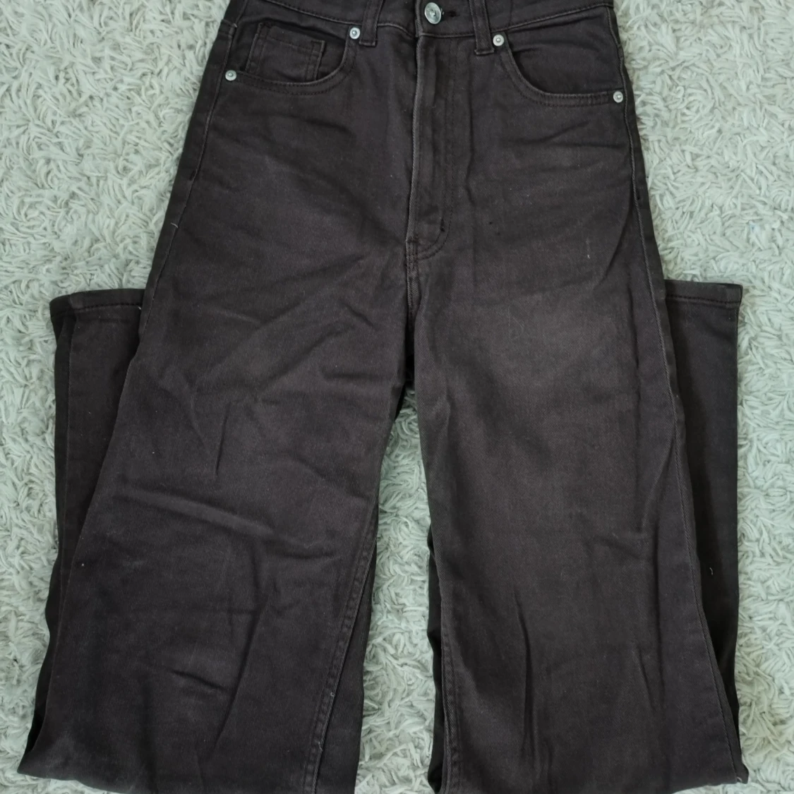 Snygga bruna jeans med hög midja och raka, vida ben. Klassisk femficksmodell med bälteshällor och knappgylf. Från H&M i storlek 34 använda någon enstaka gång.