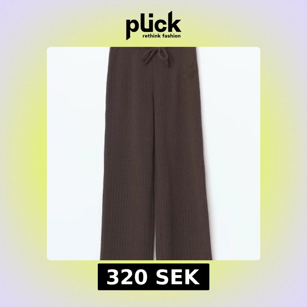 Helt nya virkade byxor med prislapp och orginalförpackning. Byxorna är bruna och har vida ben. De har knytning framtill och är låg midjade med normal passform.