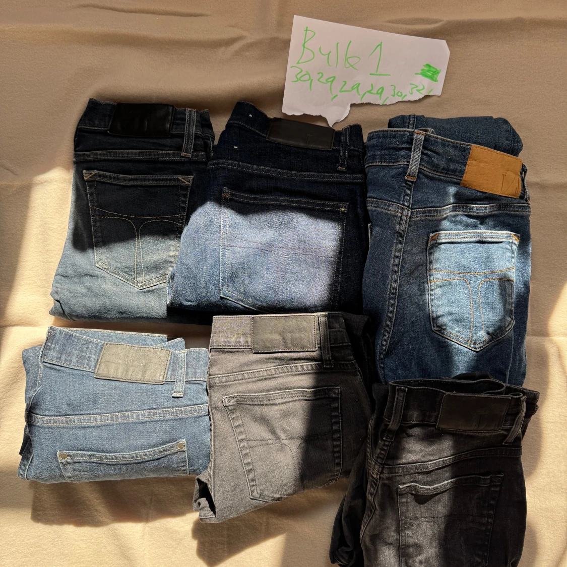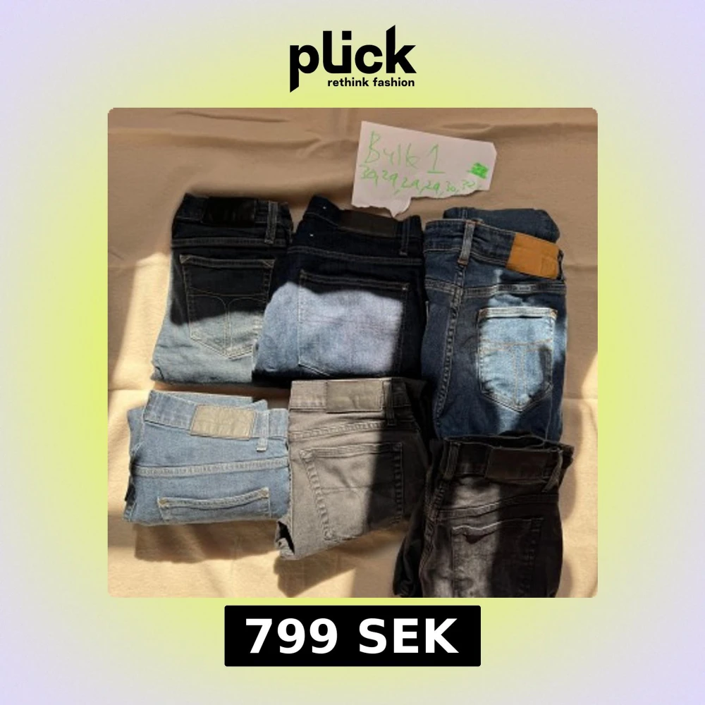 Säljer ett bulkpaket med sex par jeansbyxor i olika blå och svarta nyanser. Byxorna har klassiska femficksmodeller, raka och smala ben samt detaljer som bakfickor med sömmar och läderpatch. Perfekt för dig som vill ha flera stilar att välja mellan. Blandade storkekar blandade modeller och defekter kan förekomma