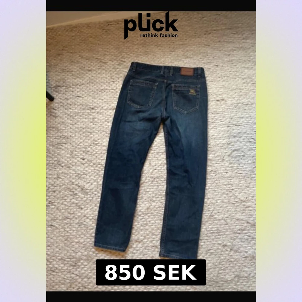 Snygga mörkblå jeans från Burberry med klassisk straight fit och broderad Burberry-logga i guld på bakfickan. Jeansen har fem fickor, bälteshällor och detaljerade sömmar med färginslag. Perfekt för dig som gillar stilrena designer. Nypris 7600kr Midja 45cm längd 100cm skick 9/10