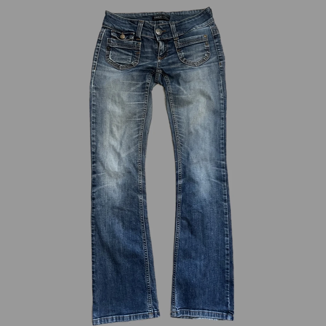 Så snygga lågmidjade y2k bootcut jeans från Only! midjemåttet: 38cm tvärsöver innerbenslängd: 80cm! Har ingen bild på då de är för smala!