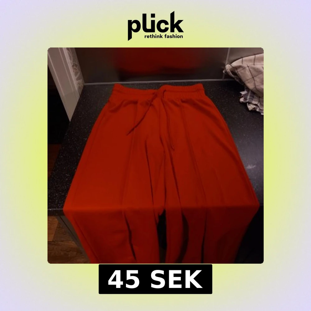 Snygga och bekväma röda byxor med elastisk midja och snörning. Perfekta för en avslappnad stil. Finns inga tecken på användning. Står att dem är L men skulle mer säga att dem är M.