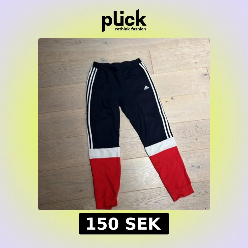 Snygga Adidas träningsbyxor i marinblått med vita ränder längs sidorna och logga på låret. Nedre delen av benen är röda med vit kontrastpanel. Mjuk och skön polyester, elastisk midja och fickor på sidorna.