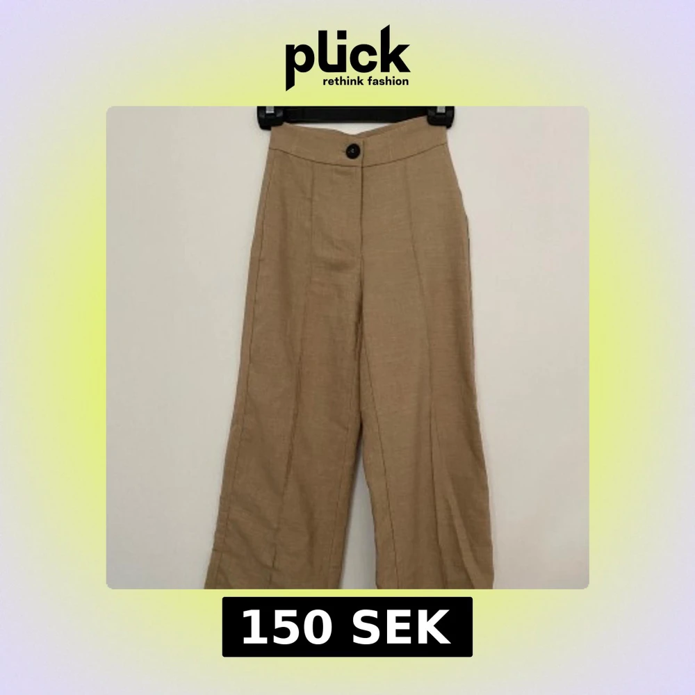 Snygga beige byxor från Bershka i storlek 32. Byxorna har hög midja, raka ben och en bred linning med svart knapp framtill.