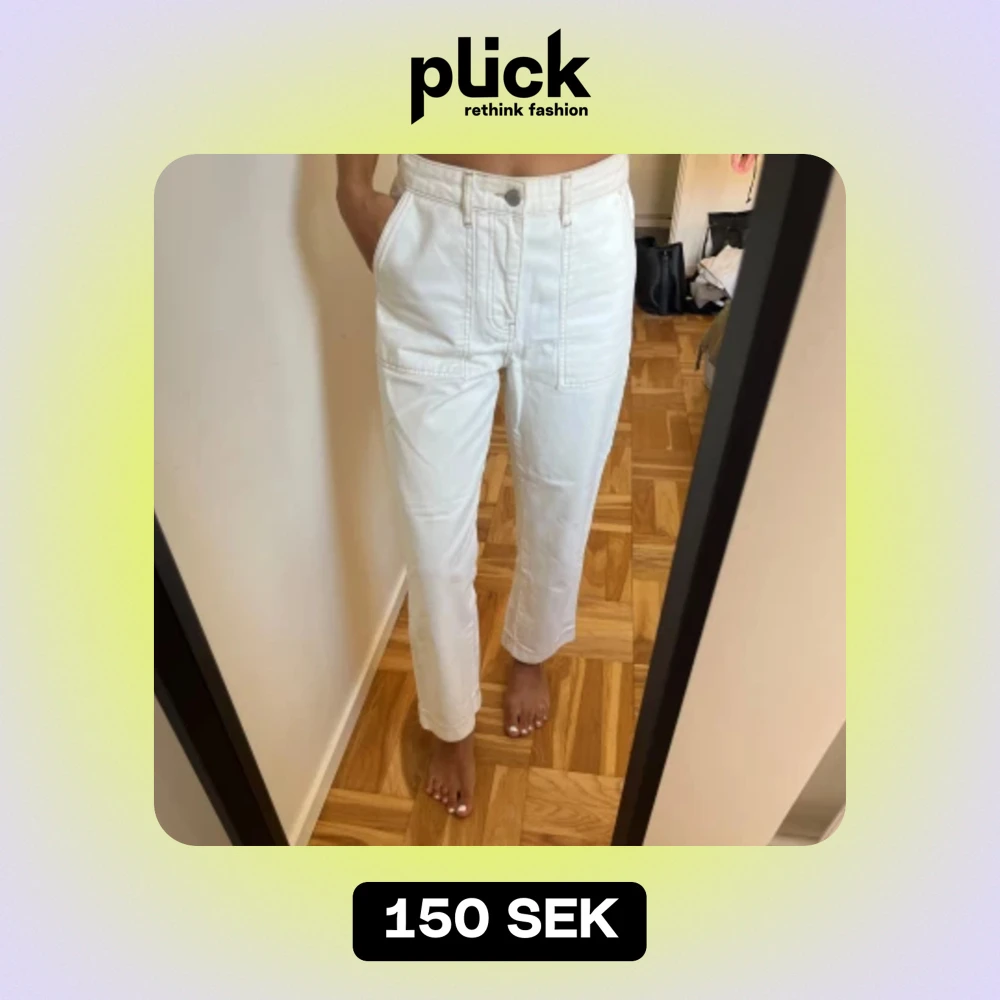 Säljer ett par vita högmidjade byxor. De är i normal passform och har en dragkedja och knapp framtill. Byxorna är i bomull och har en straight stil. De är i använt skick med några fläckar som syns på bilderna. Perfekta för sommaren!