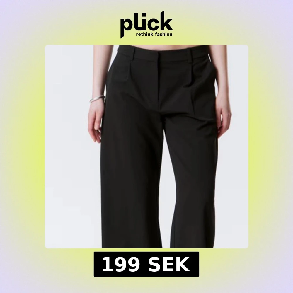 Snygga svarta kostymbyxor med vida ben och klassisk passform. Byxorna har hällor för bälte och pressveck framtill, perfekta för en clean och stilren look. Medelhög midja. Säljer då de är för små (har storlek M så skulle säga att de passar xs/S). Är osäker på märke men troligast H&M. Endast använd en gång till en begravning.