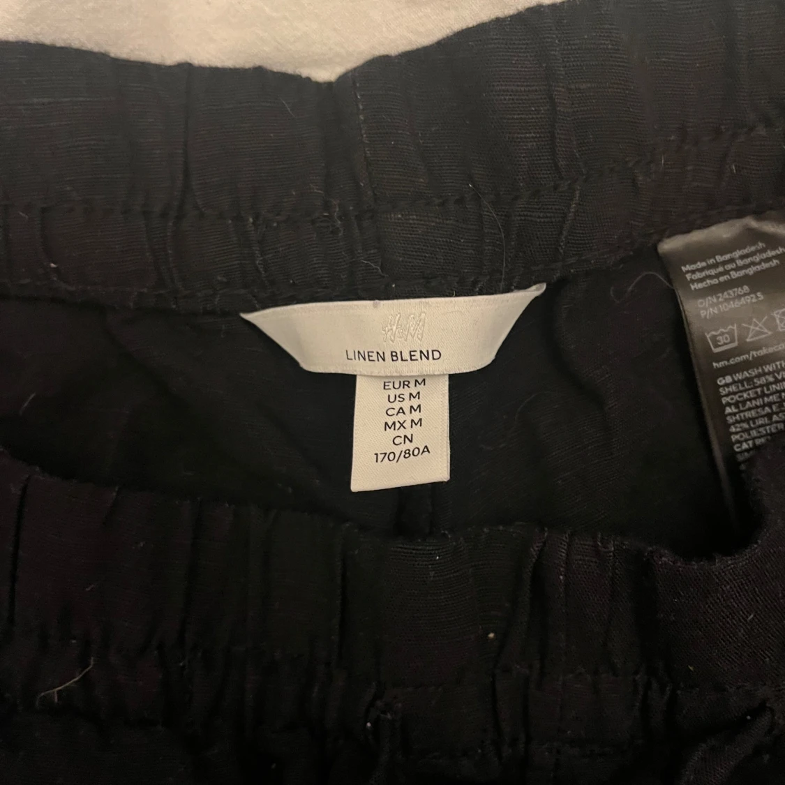 Säljer ett par svarta linnebyxor från H&M i storlek M. Byxorna har en avslappnad passform med dragsko i midjan för justerbar komfort. Perfekta för en stilren och bekväm look.