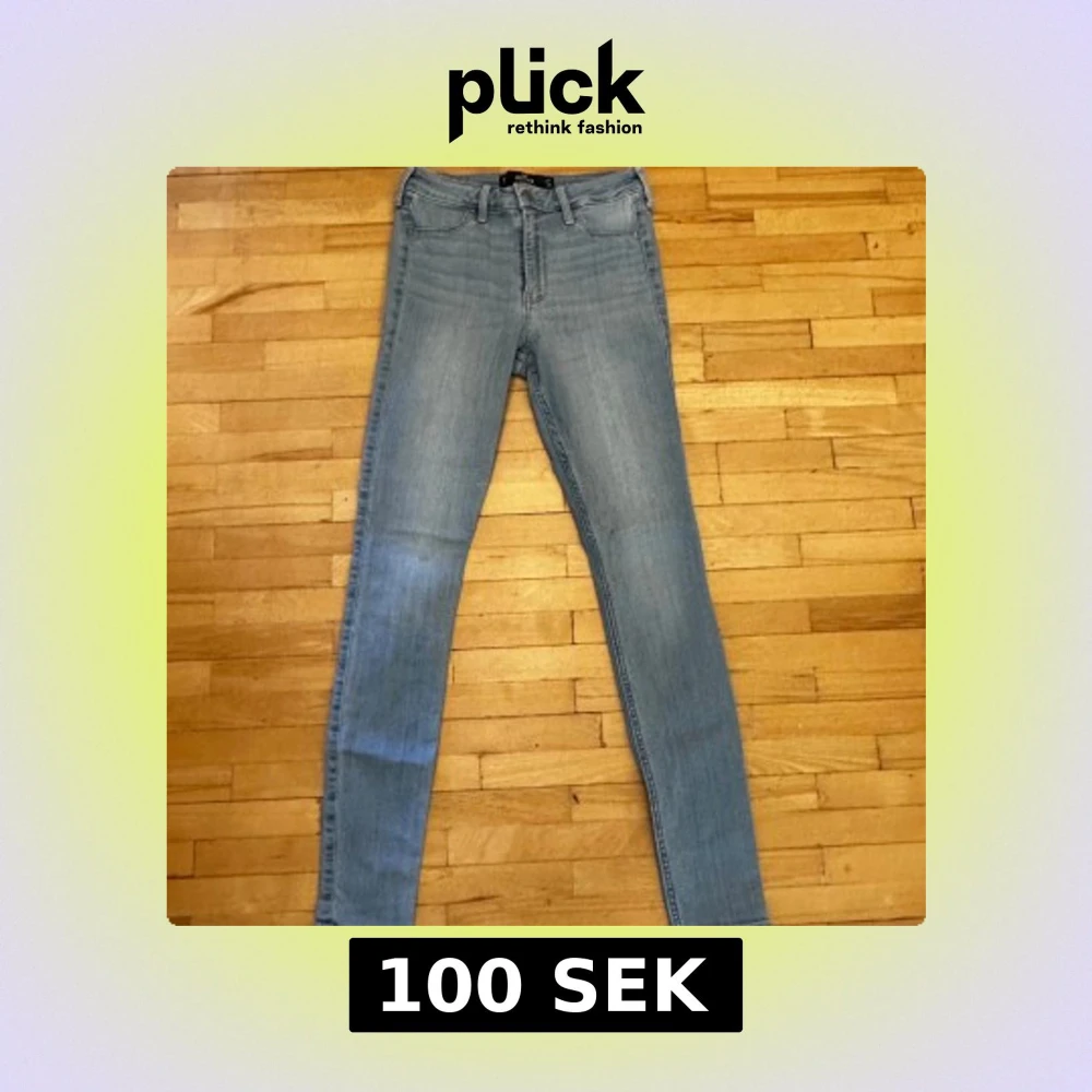 Säljer ett par ljusblå high-rise jeansleggings från Hollister. Jeansen har en smal passform, stretch och är i storlek W27 L30. Aldrig använda.