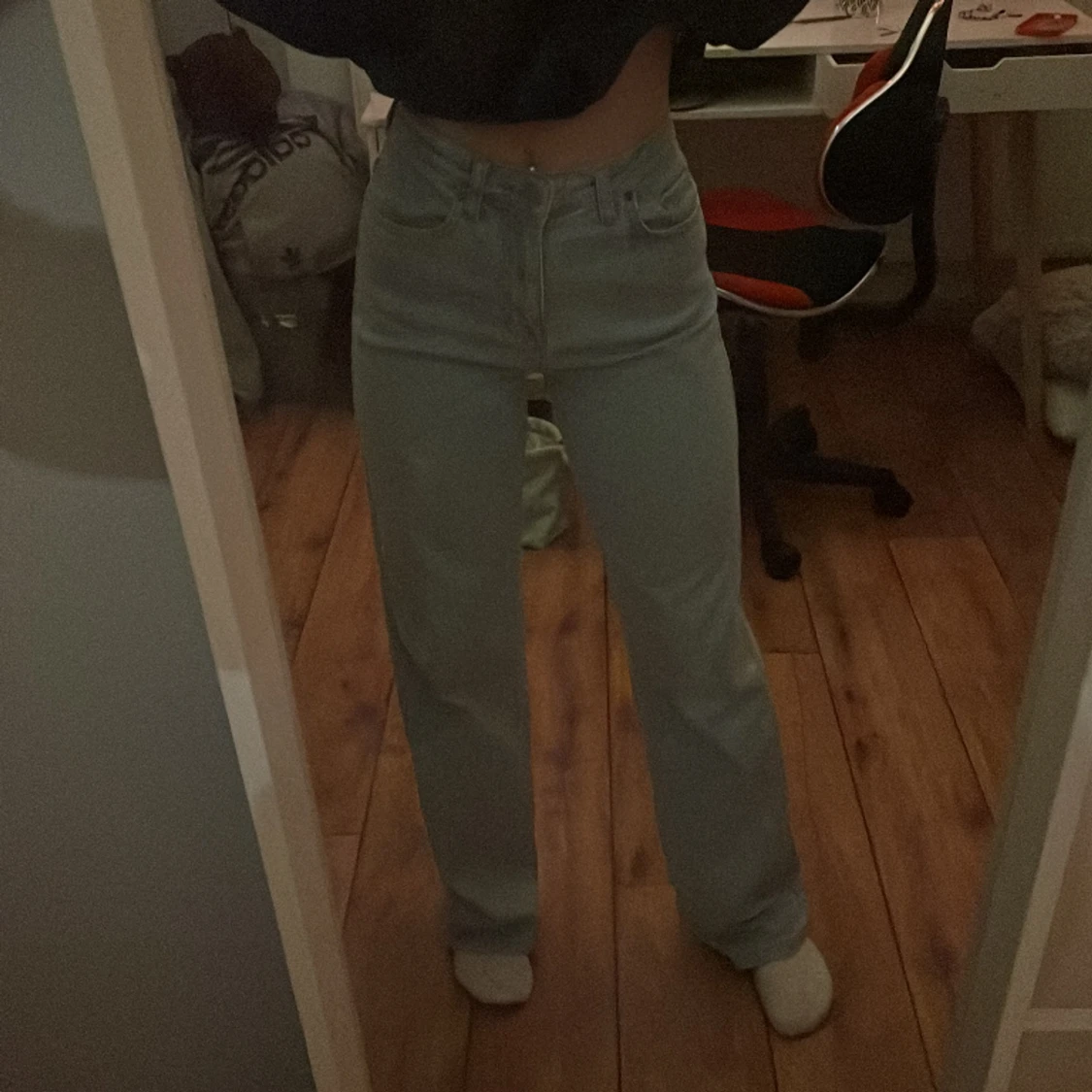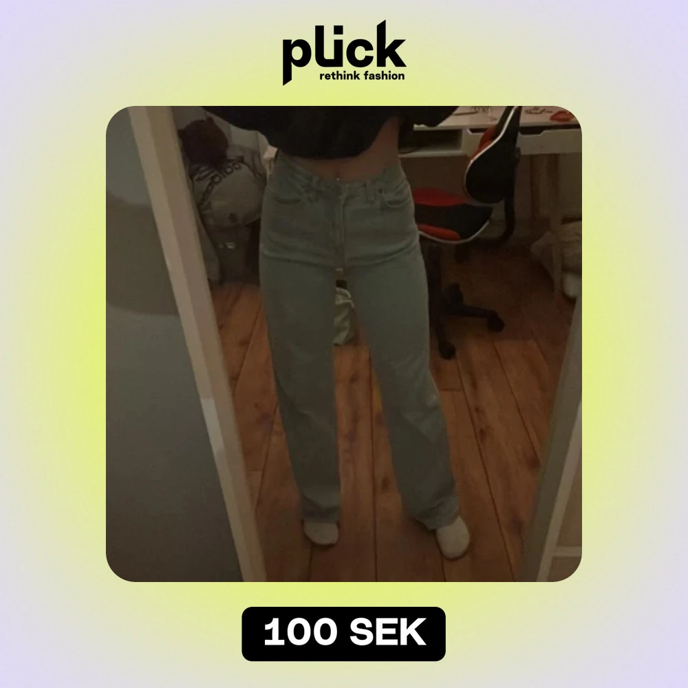 Ljusblå jeans från madlady i storlek 32. Jättebra skick utom den ljusare fläcken på ena låret som ej går bort men det märks inte tydligt ute. Skriv för fler bilder!💞