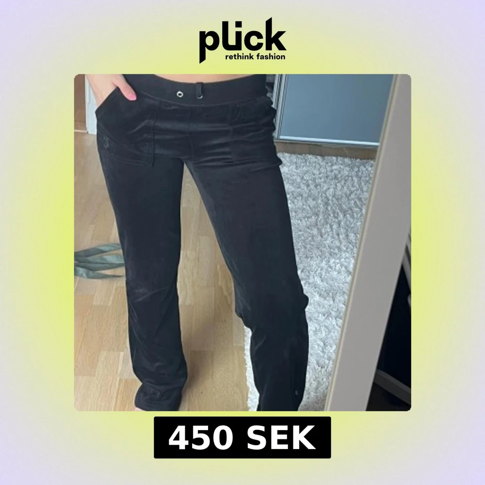 Svarta mjukisbyxor från Juicy Couture med broderad JC-logga på fickan. Byxorna har bred resår i midjan, framfickor och bakfickor med silvriga knappar. Materialet är mjukt och sammetliknande, perfekt för chill dagar. Snygg, rak passform som sitter skönt. Snöret finns de men ena har försvunnit i byxan. Men de går att få ut.