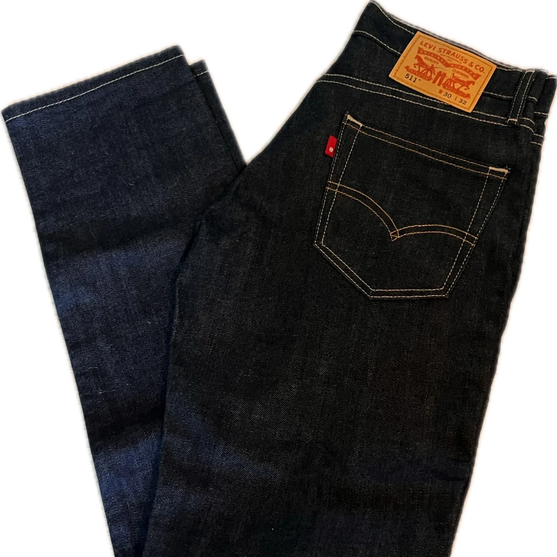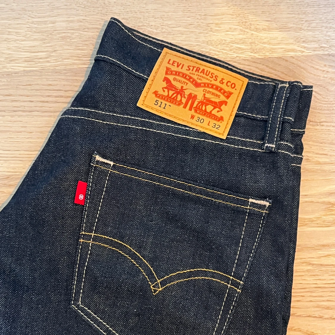 Snygga Levi's 511 jeans i mörkblå denim med klassiska kontrastsömmar och röd logotagg vid bakfickan. Femficksdesign. Helt nya, oanvända.