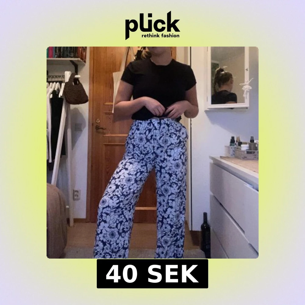 Snygga blommiga byxor i svart och vitt med hög midja och loose fit. Perfekta för en avslappnad stil med ett elastiskt midjeband för extra komfort. Från Gina i storlek S