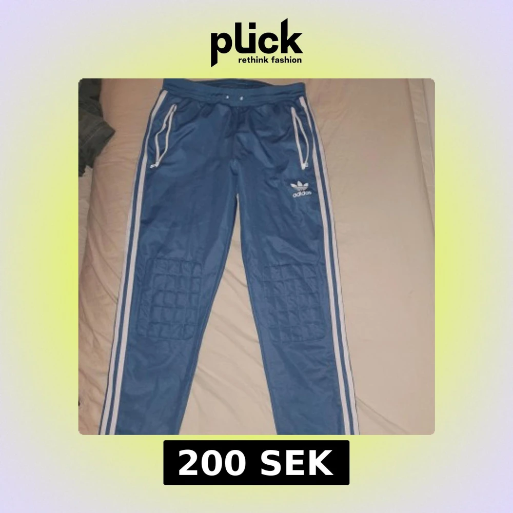 Snygga blå byxor från Adidas. Byxorna saknar snören men annars inga defekter. Vadderade knäpartier för extra komfort. Perfekta för sport och träning.