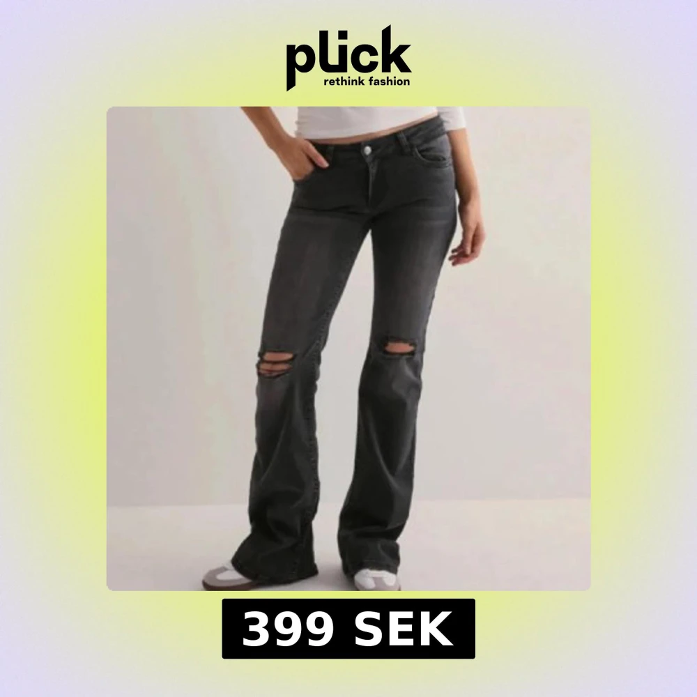 Snygga svarta lågmidjade bootcut jeans med hål från Nelly i storlek 38! Säljer då de inte passar mig. Nypris 699kr 🖤🖤