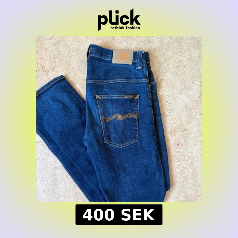 Snygga blå jeans från Nudie Jeans, modell Thin Finn. Tillverkade i 98% ekologisk bomull och 2% elastan för en bekväm passform. Klassisk design med fem fickor och orange sömmar.