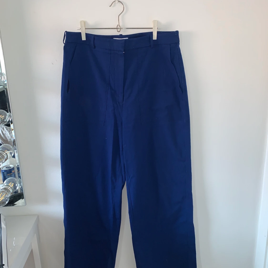 Oversized fit marinblå byxor från &otherstories, säljes för att de inte kommer till användning. Byxorna är använda men inte slitna, nypris 600kr säljes för 200 exklusive frakt. Storlek 42 men passar storlek 40 för en oversized look:)