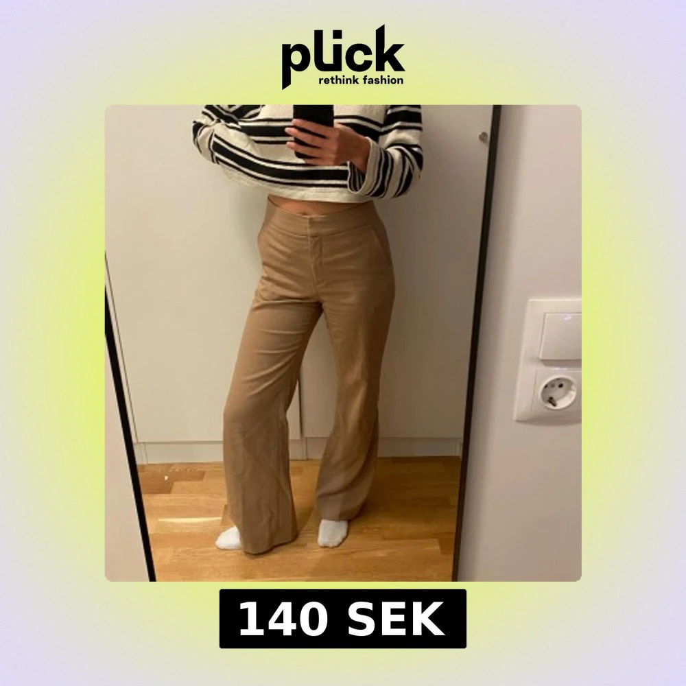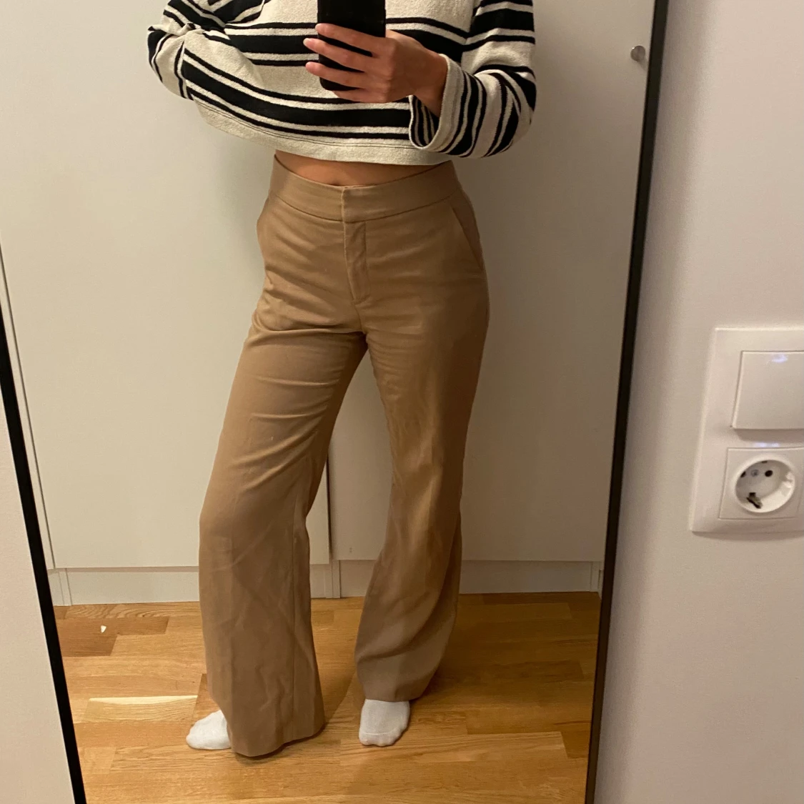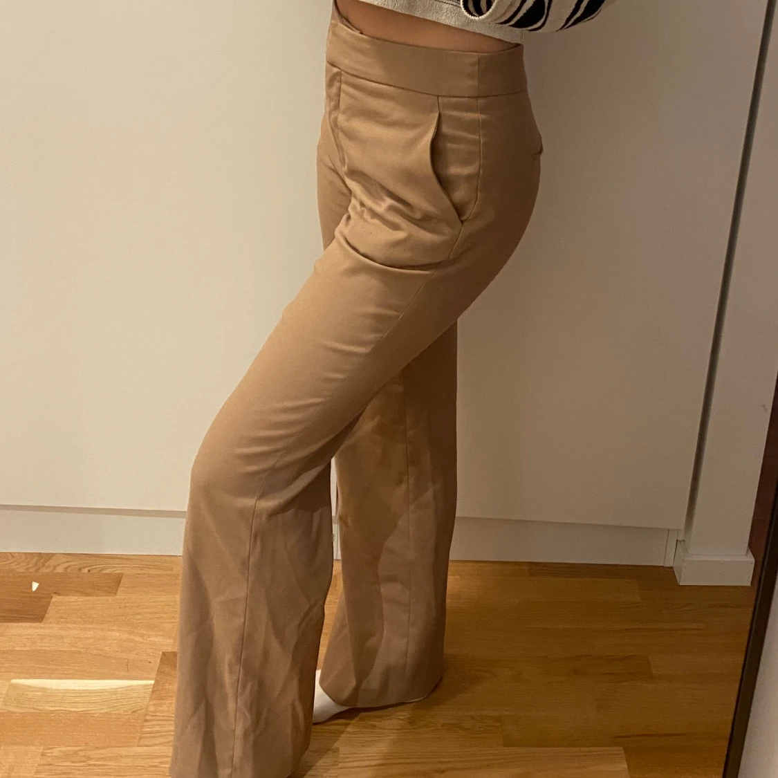 Snygga beiga byxor med hög midja och vida ben. Byxorna har en stilren look utan synliga fickor framtill och är tillverkade i ett mjukt, lätt material som ger en skön känsla. 🌸💕