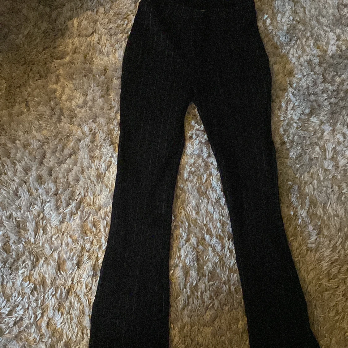 Snygga svarta byxor med tunna vita ränder och bootcut-snitt. De har hög midja och sitter tajt upptill med utsvängda ben. Perfekta för dig som gillar en stilren och trendig look. Materialet känns mjukt och stretchigt, vilket gör dem riktigt bekväma.