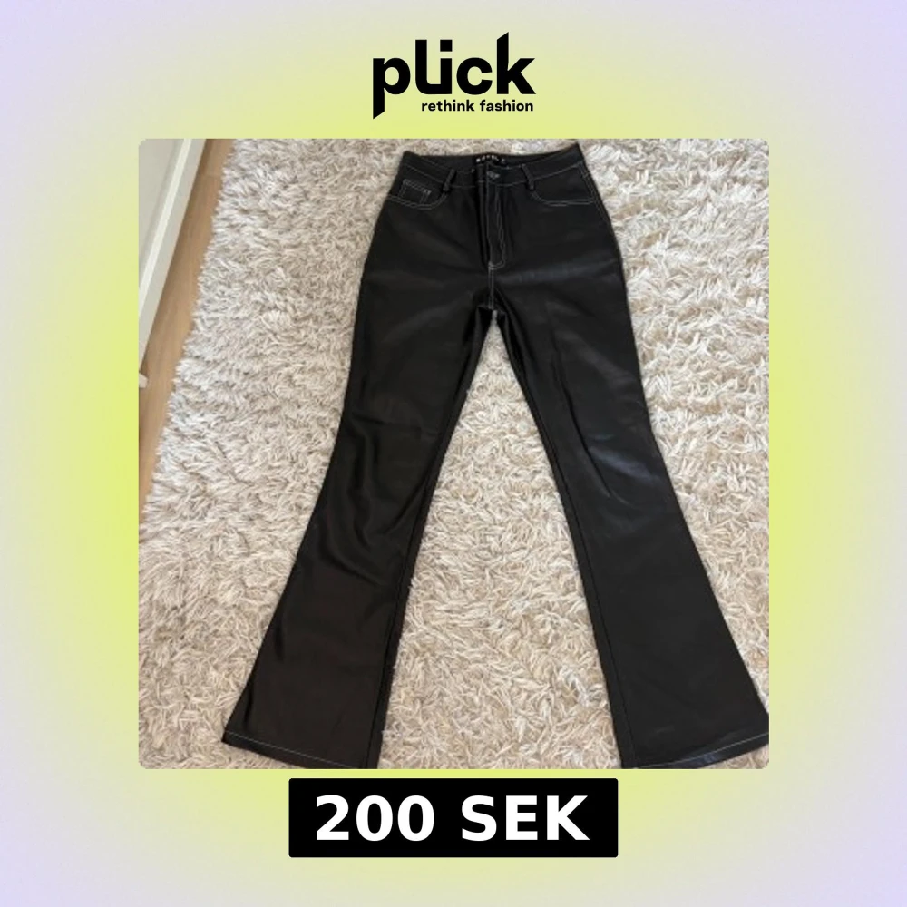 Snygga svarta byxor från Motel i skinnimitation med vita kontrastsömmar. Modellen är bootcut med hög midja och klassiska fickor både fram och bak. Perfekta för dig som vill ha en edgy vibe och sticka ut lite extra. Skriv frågor och skicka gärna prisförslag!💕