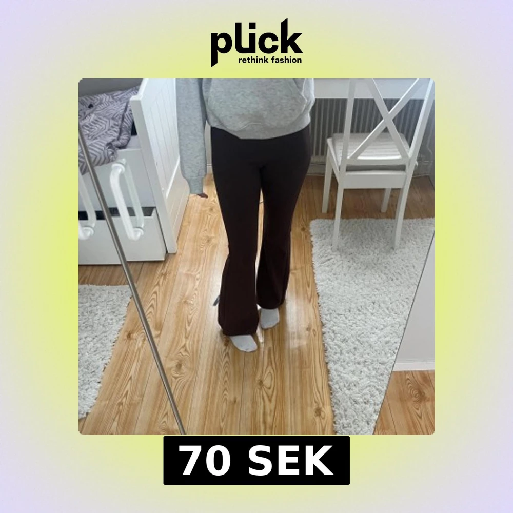 Säljer ett par bruna ribbade byxor. De har bootcut-modell med utsvängda ben och hög midja. Materialet är mjukt och stretchigt, perfekt för en chill och snygg look. Passar dig som gillar bekväma men trendiga byxor.
