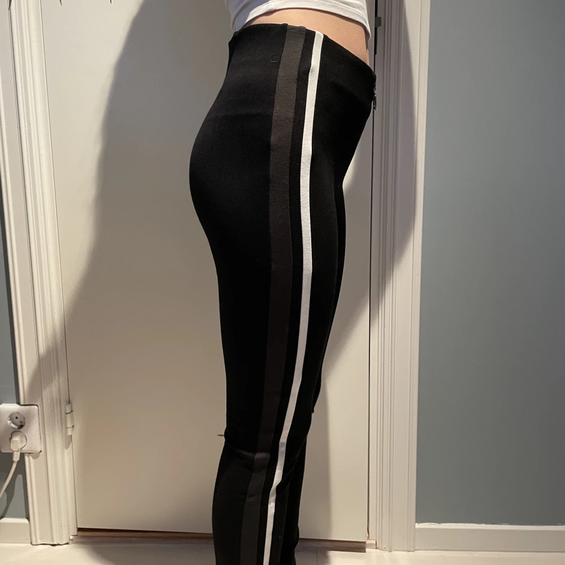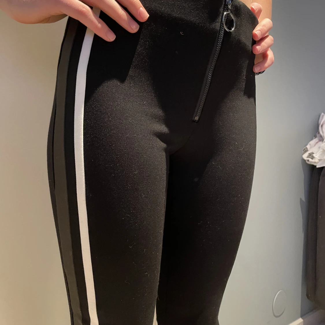 Tights byxor från zara i storlek S (trafaluc collection) använda 2-3 gånger Vita och gröna stripes på båda sidor samt dragkedja i mitten.