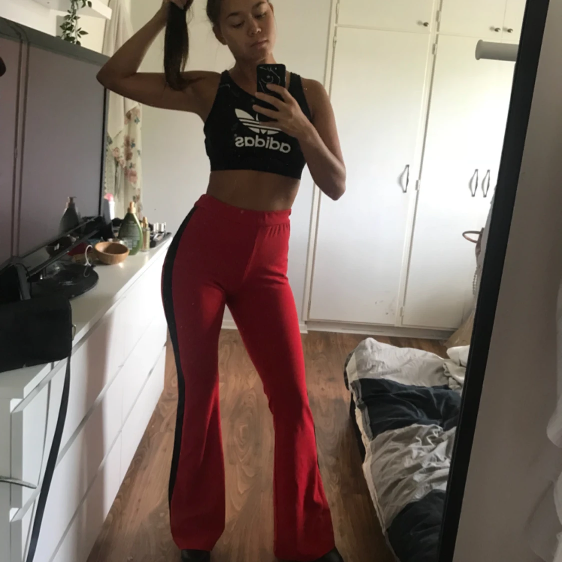 Röd/svarta flarebyxor i stl onesize men skulle säga att dom passar dig som är en S eller liten M. :) Köparen står för frakten! (55kr)