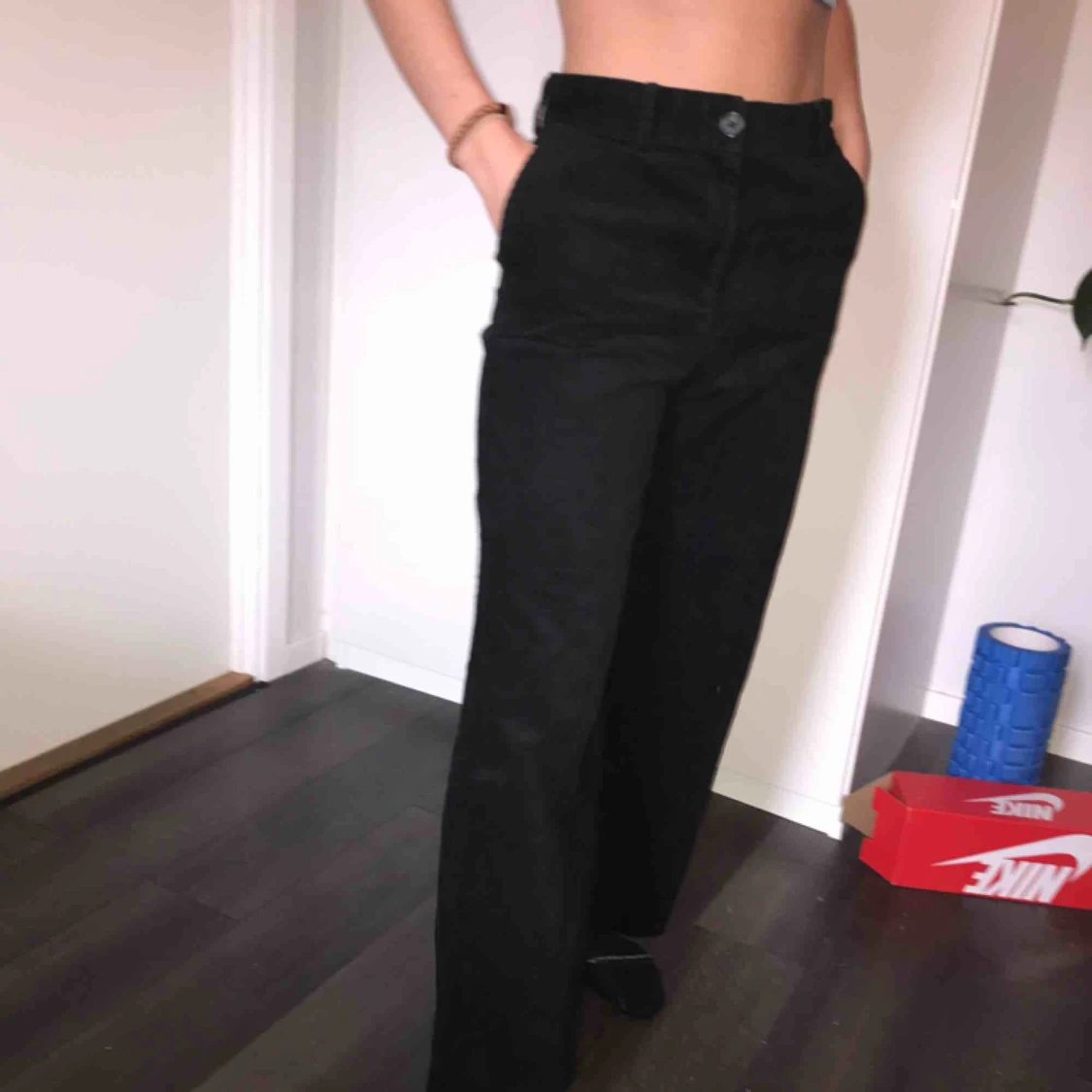 Svarta Manchester byxor från monki. Sitter perfekt i midjan och i längden. Finns en bak ficka som inte syns på bilderna. Fina knappar både fram och bak.