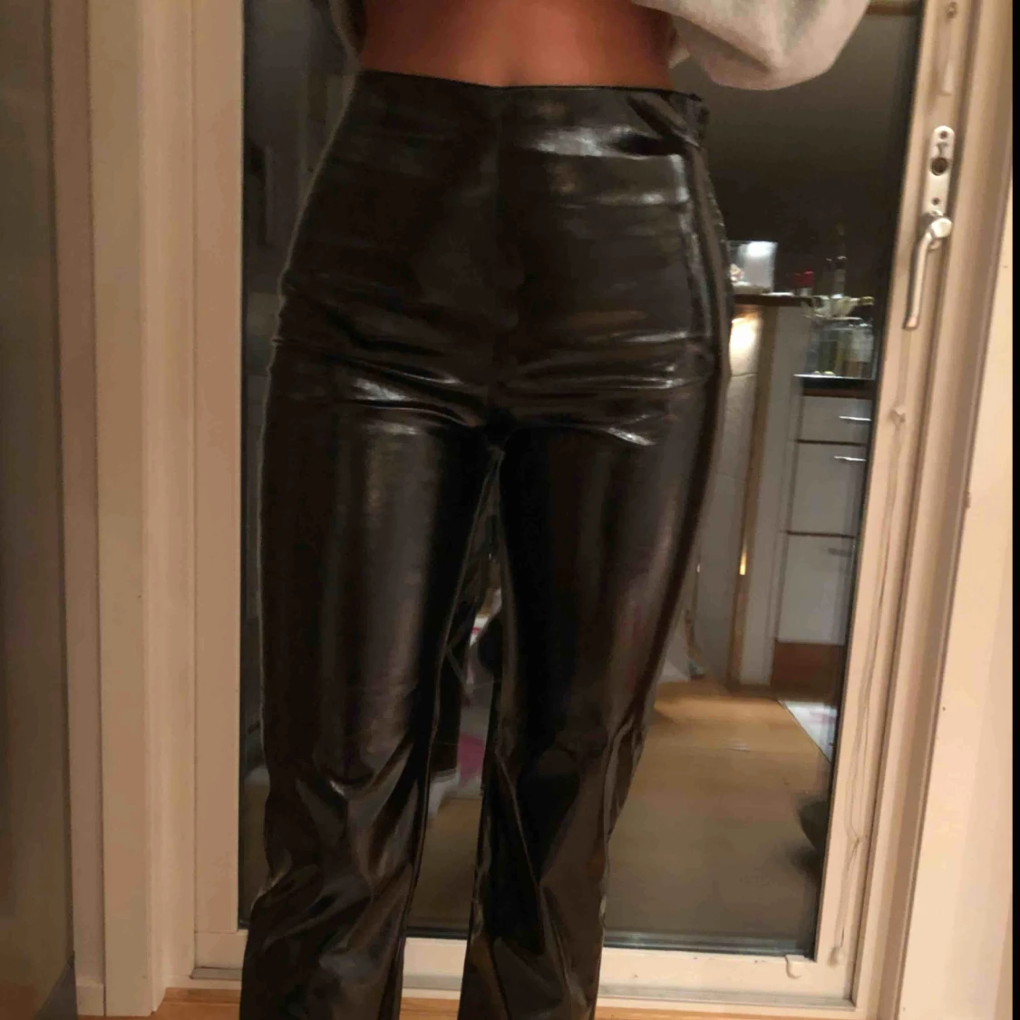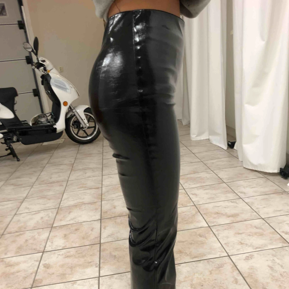 Ett par vida svarta lackbyxor som är korta i modellen.