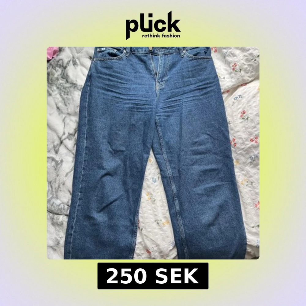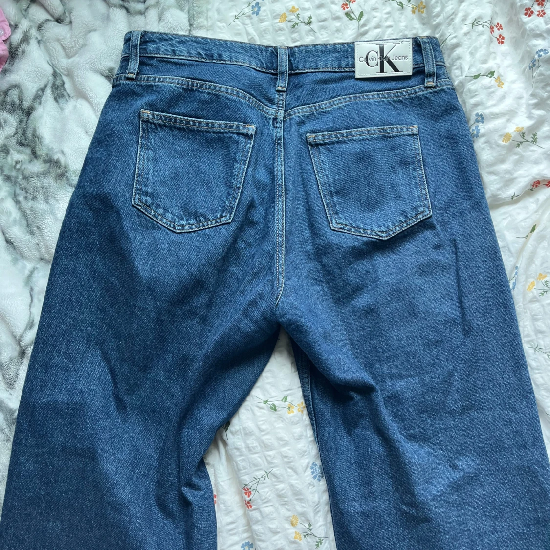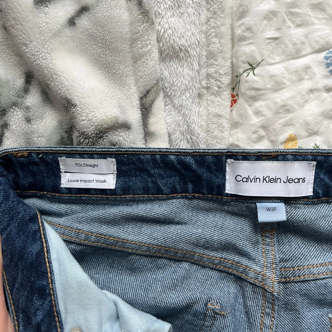 Säljer ett par klassiska blå jeans från Calvin Klein Jeans i modellen 90s Straight. Jeansen har rak passform, normal midja och fem fickor. Tillverkade i robust denim med snygg tvätt och ikonisk CK-patch bak i midjan.