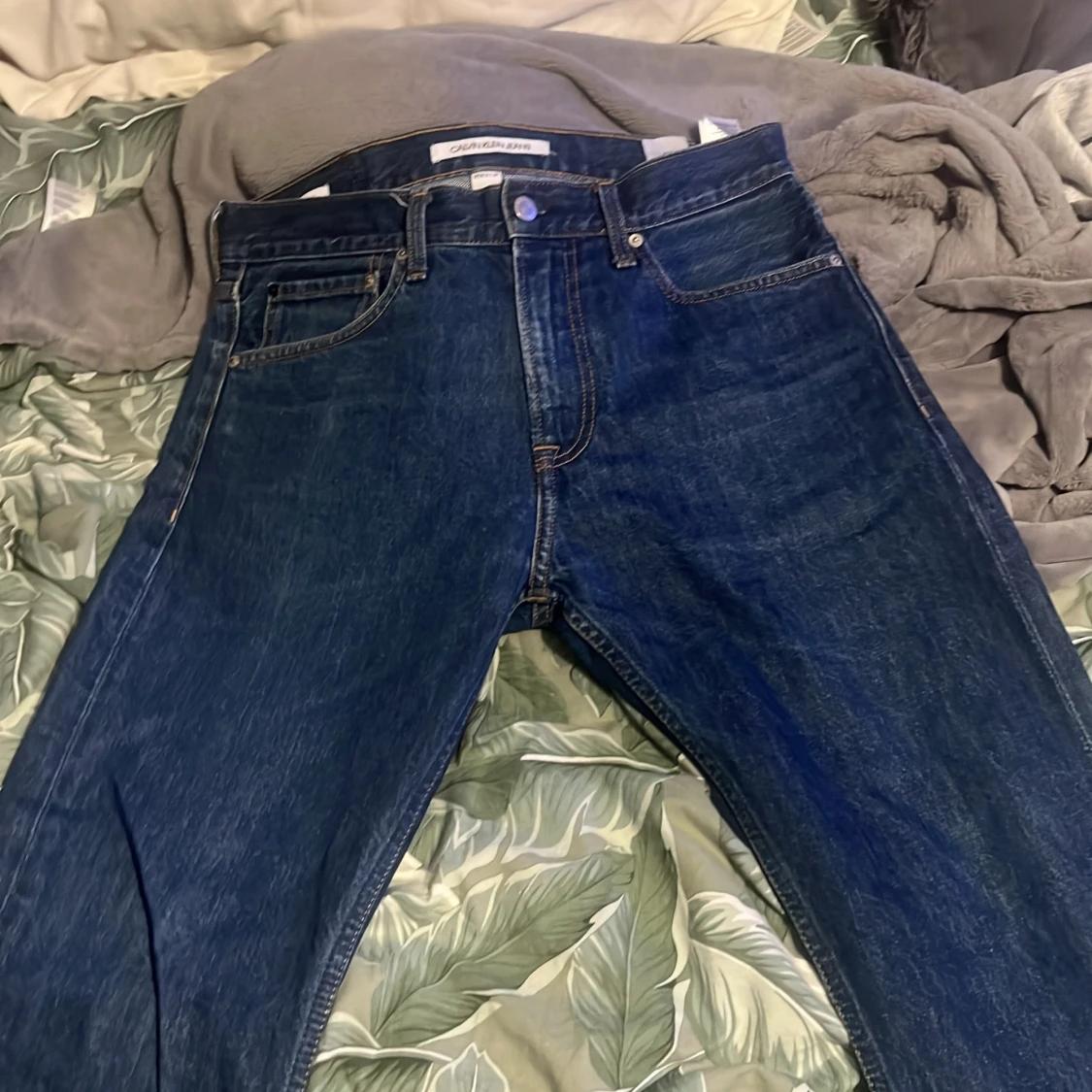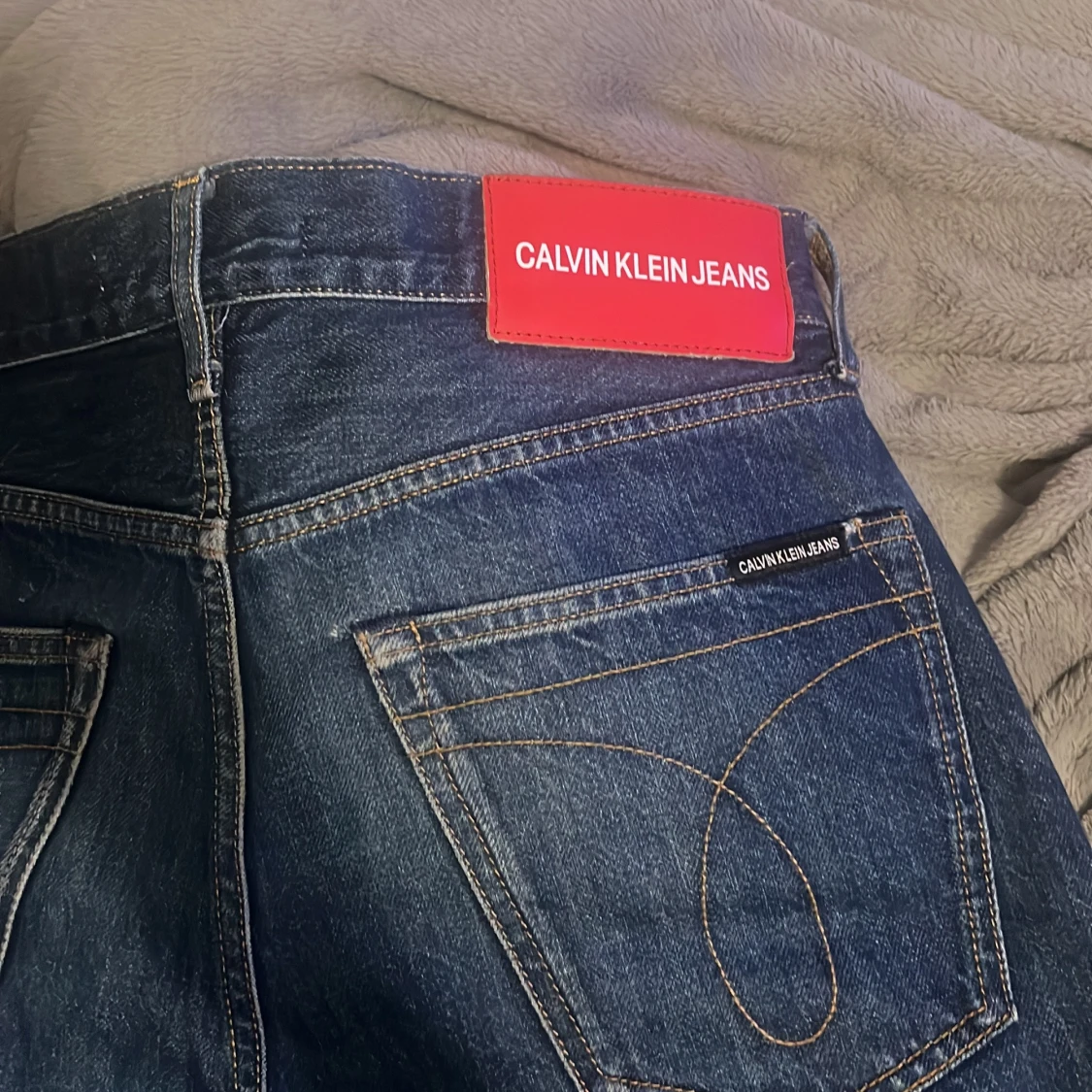 Mörkblå jeans från Calvin Klein Jeans med klassisk femficksdesign och snygga kontrastsömmar. Byxorna har en tydlig röd logotyppatch bak i midjan och subtil logga på bakfickan. Jeansen är raka i modellen och tillverkade i slitstarkt denim.