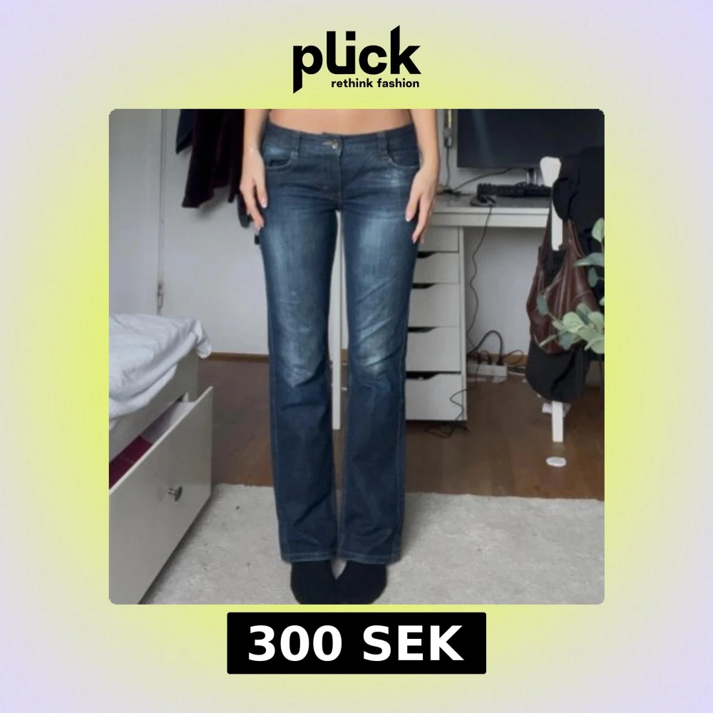Snygga mörkblå jeans med bootcut passform och klassiska fickor både fram och bak. Jeansen har ljusare slitningar på låren och bak, samt dekorativa sömmar och knappar på bakfickorna. Perfekta för dig som gillar en tidlös men trendig look. Skulle säga att storleken är 36/38 🩷