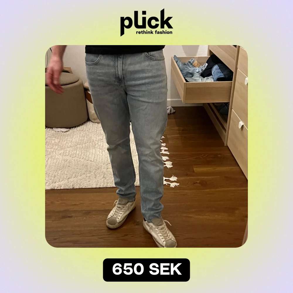 Blåa Calvin Klein slim tapered jeans i storleken W32 L30 och nypris är 1399kr. Jag är 177cm och väger 76kg