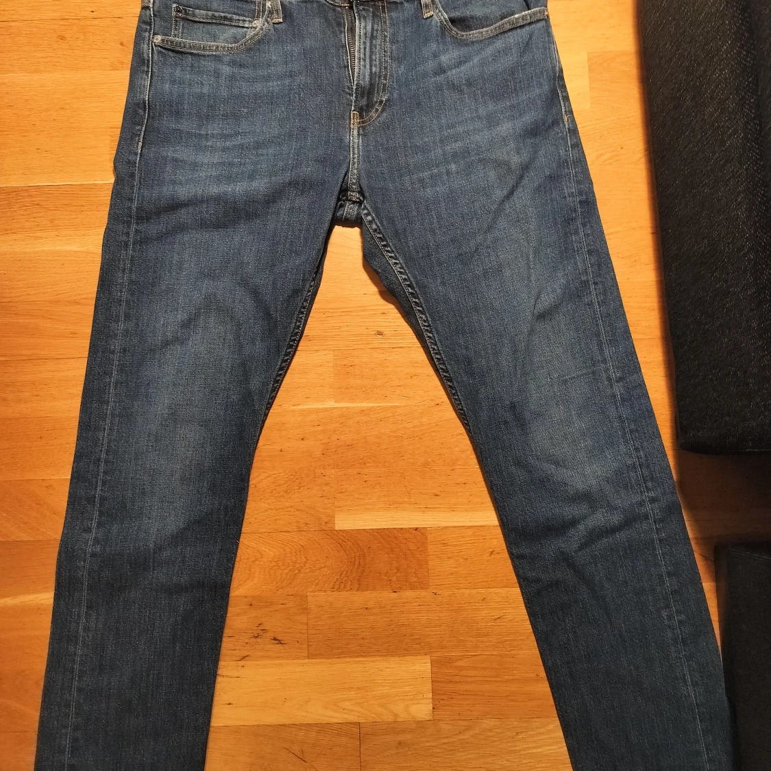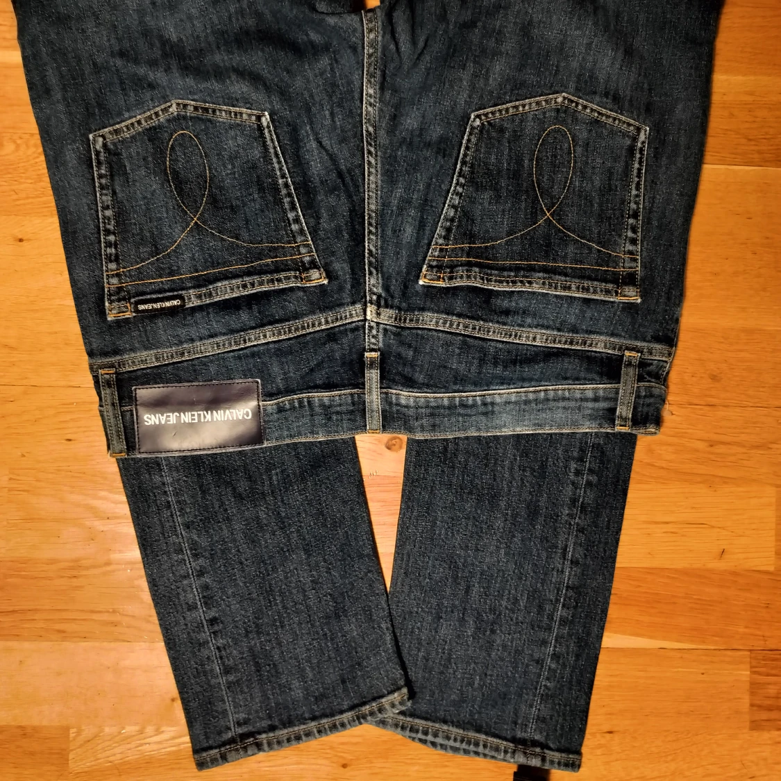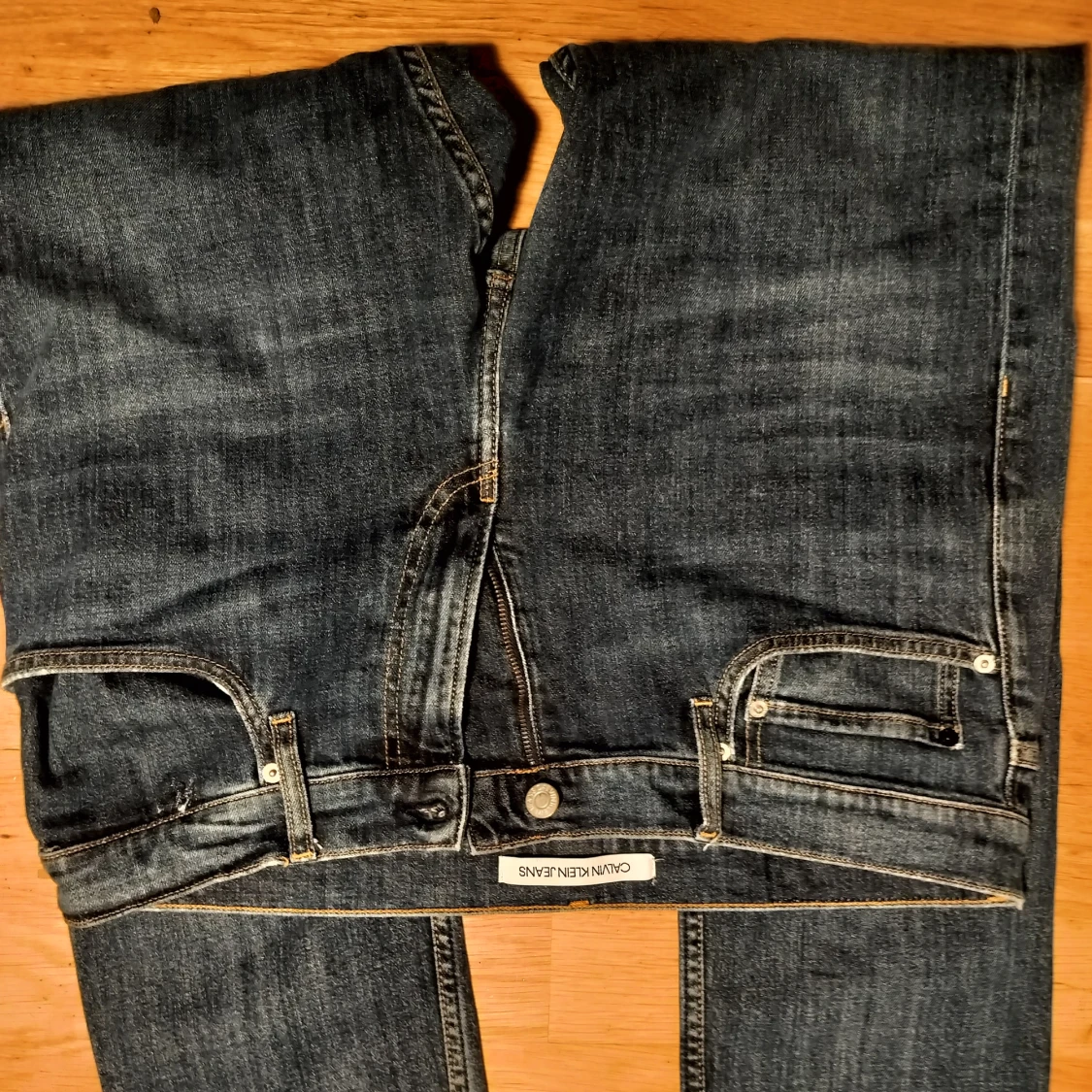 Snygga blå jeans från Calvin Klein med klassisk femficksdesign och knappgylf. Jeansen har en rak passform och är perfekta för en avslappnad stil. Märkeslogga på bakfickan ger en extra touch av stil. Obs dessa är helt nya, som man ser på ena bilden så sitter en del av tagen kvar, det är stretch i dom. Pris kan diskuteras 500