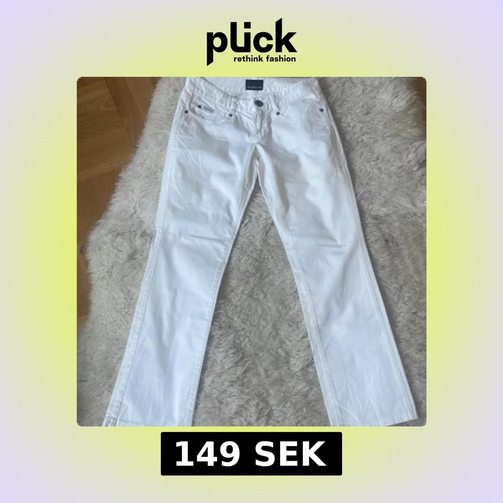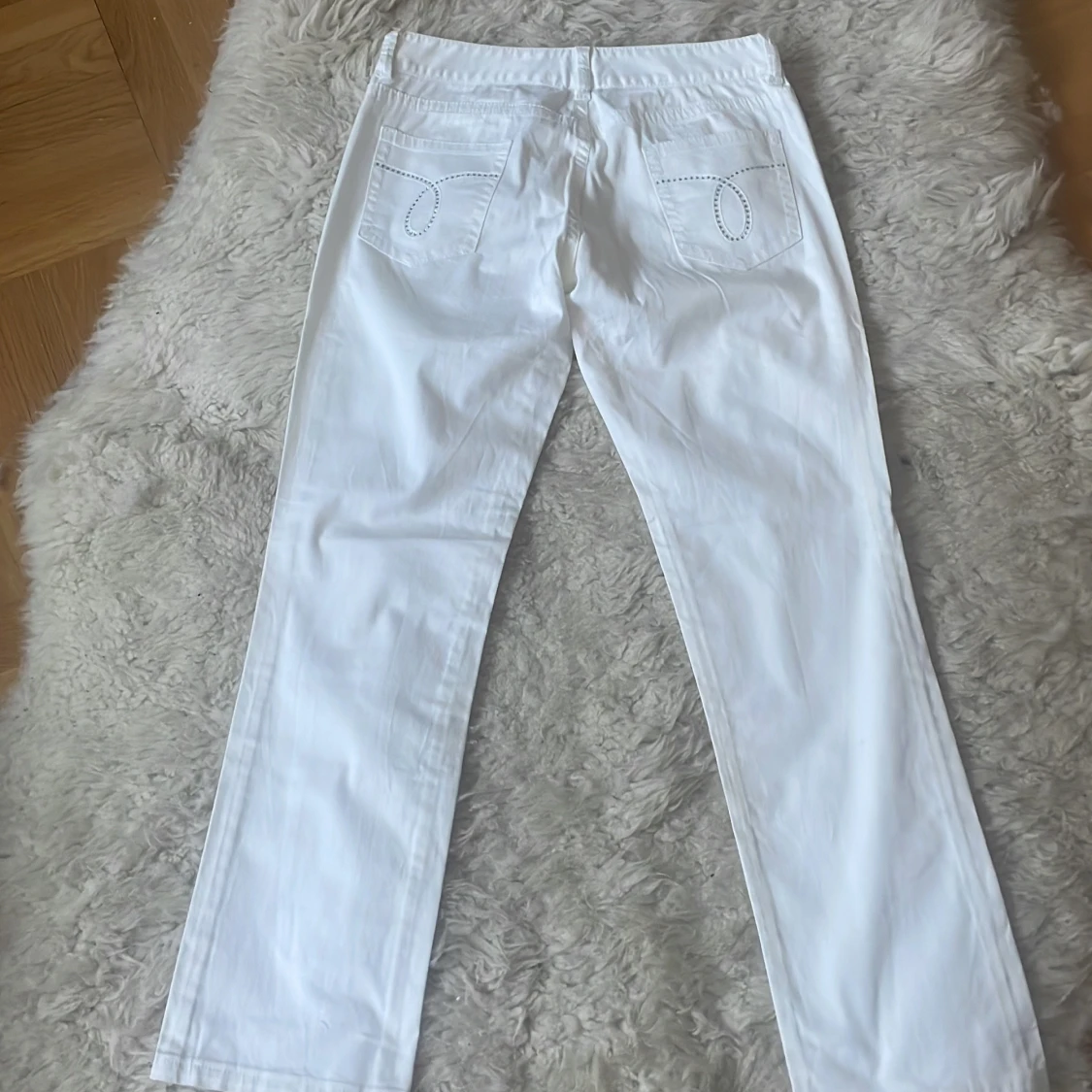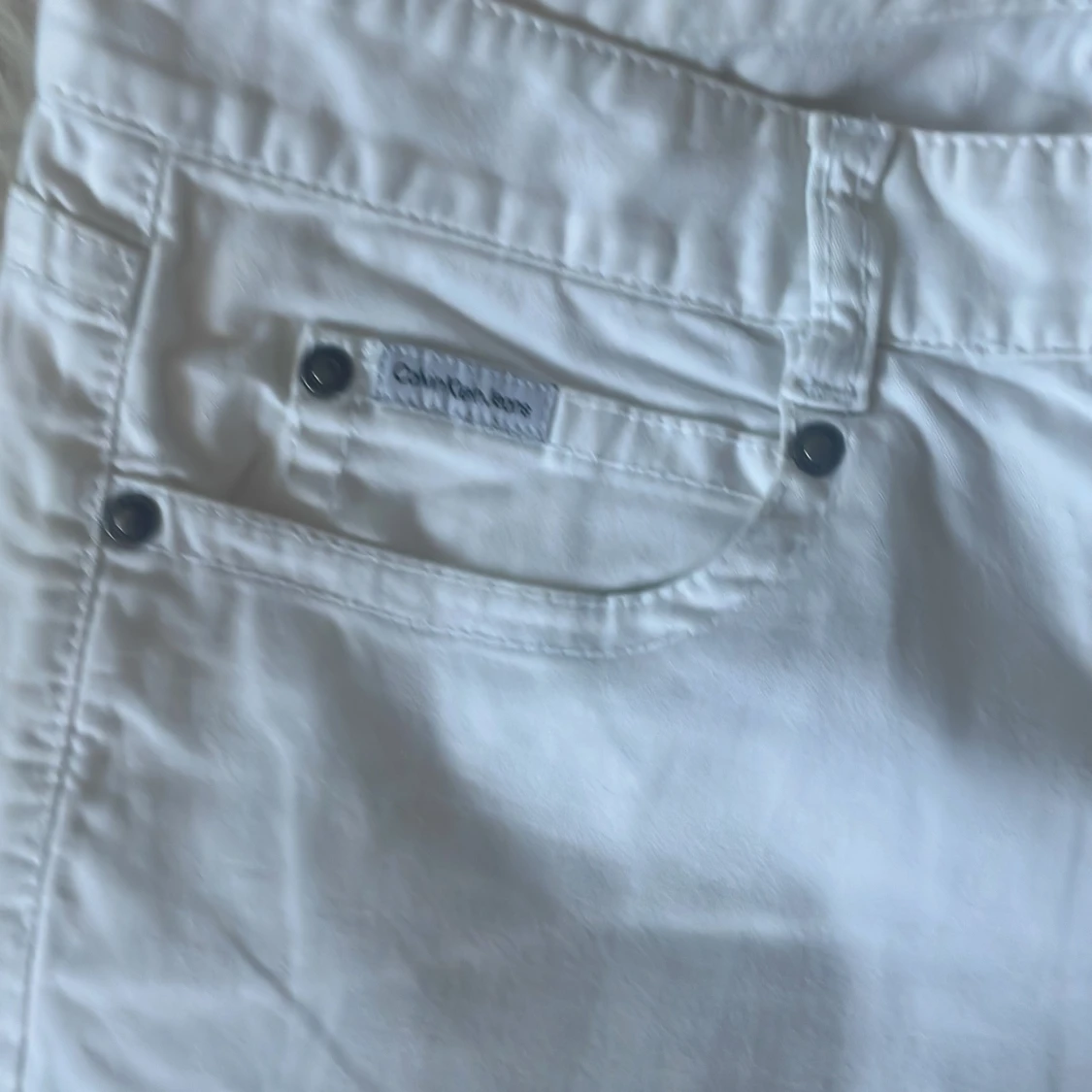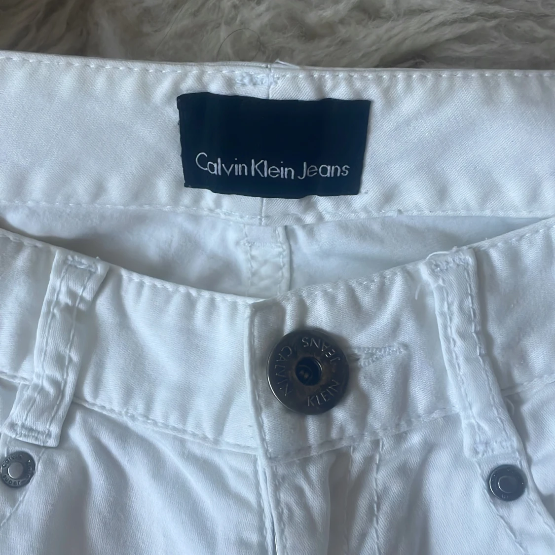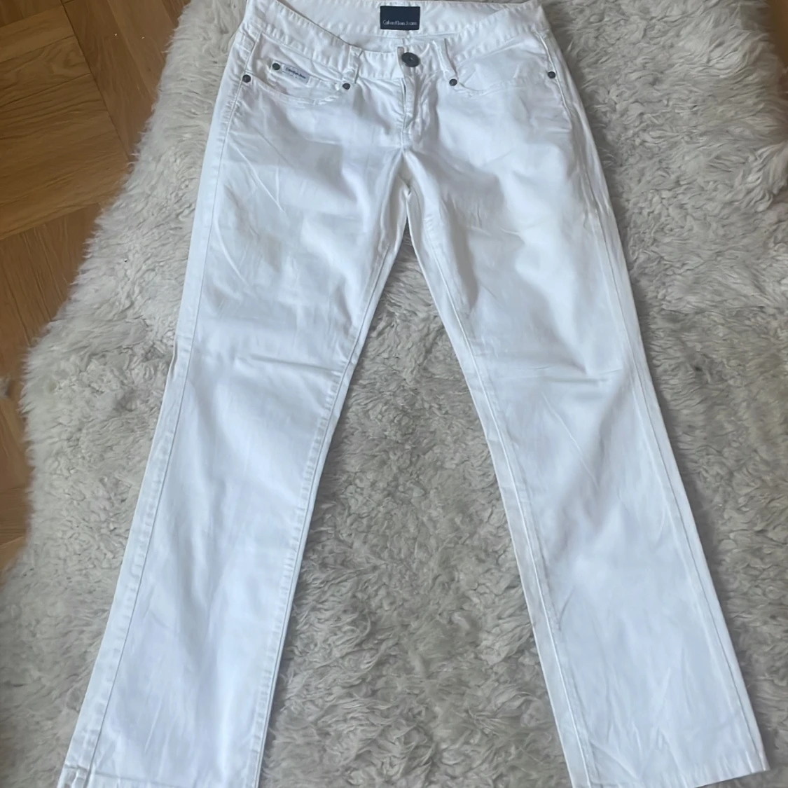 Snygga vita jeans från Calvin Klein med klassisk femficksdesign och knappgylf. Perfekta för en stilren look. De har en rak passform och är tillverkade i ett bekvämt material. Midjemått 80 cm, Innebensmått 73 cm.