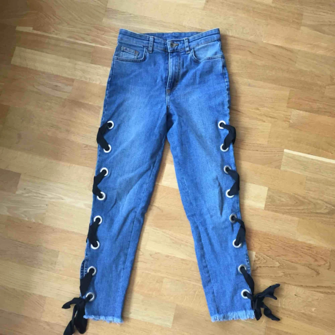 Jeans från Calzedonia i stretchigt material. Storlek s men passar XS-m pga stretch. Otroligt sköna och påminner mer om leggings/jeggings. Cool detalj på sidorna med öljetter och band! Använd 5 gånger. Nypris ca 400 kr. Kolla gärna in mina andra annonser