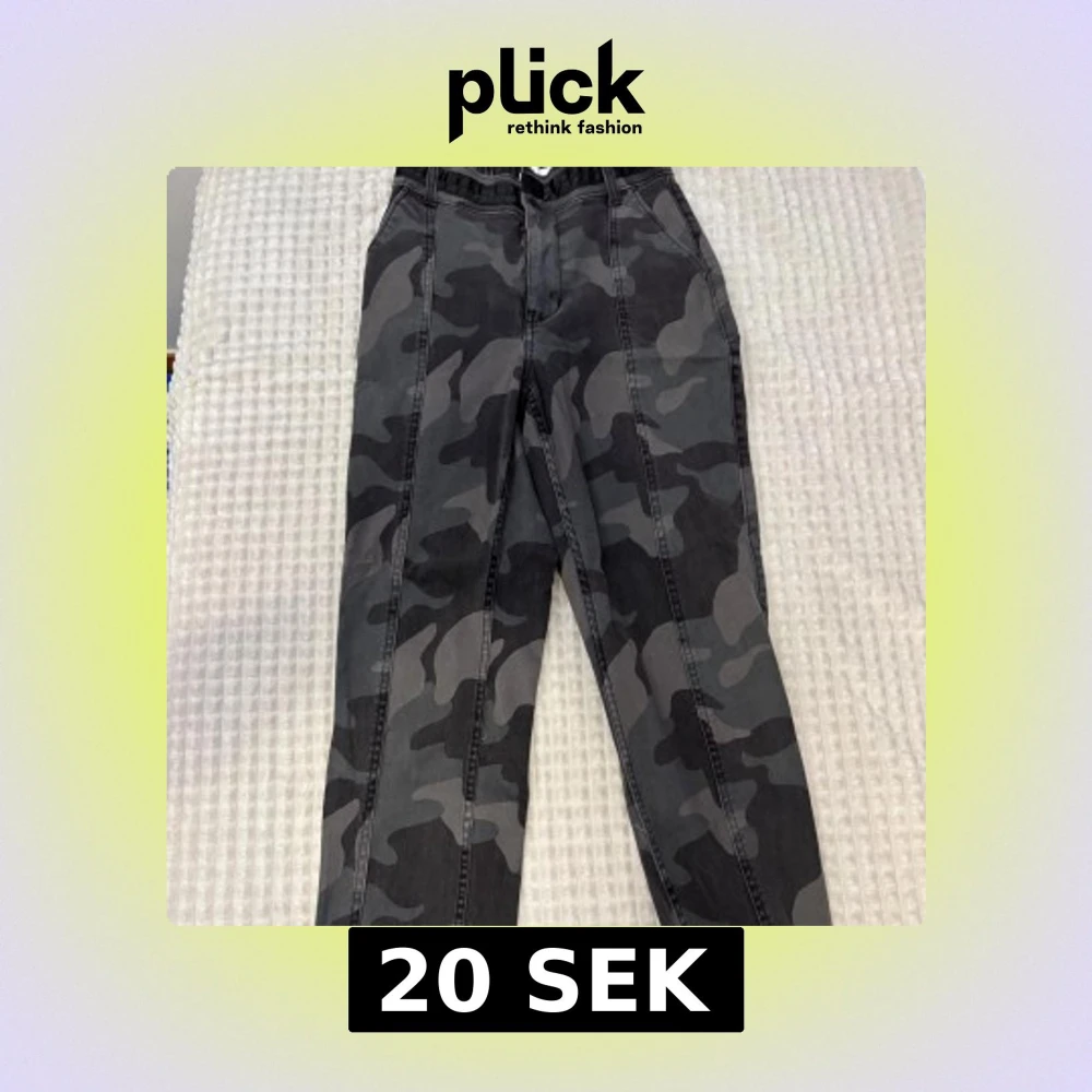Snygga cargopants från Hollister i camomönster med svarta och grå toner. Byxorna har ultrahög midja och muddar vid bensluten. Aldrig använda. Storlek xs