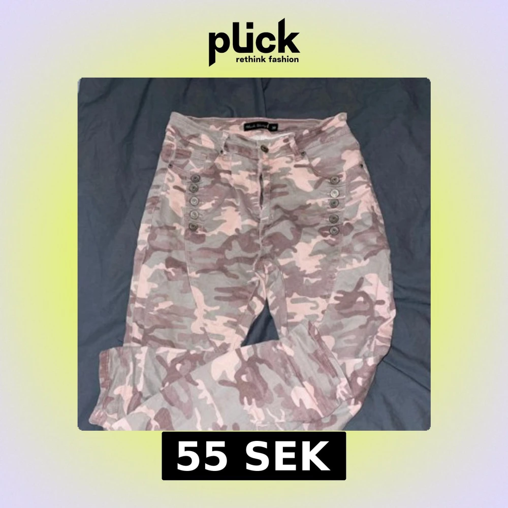 Snygga camouflagebyxor i rosa och beige med unika knapprader framtill. Perfekta för en avslappnad och trendig look.