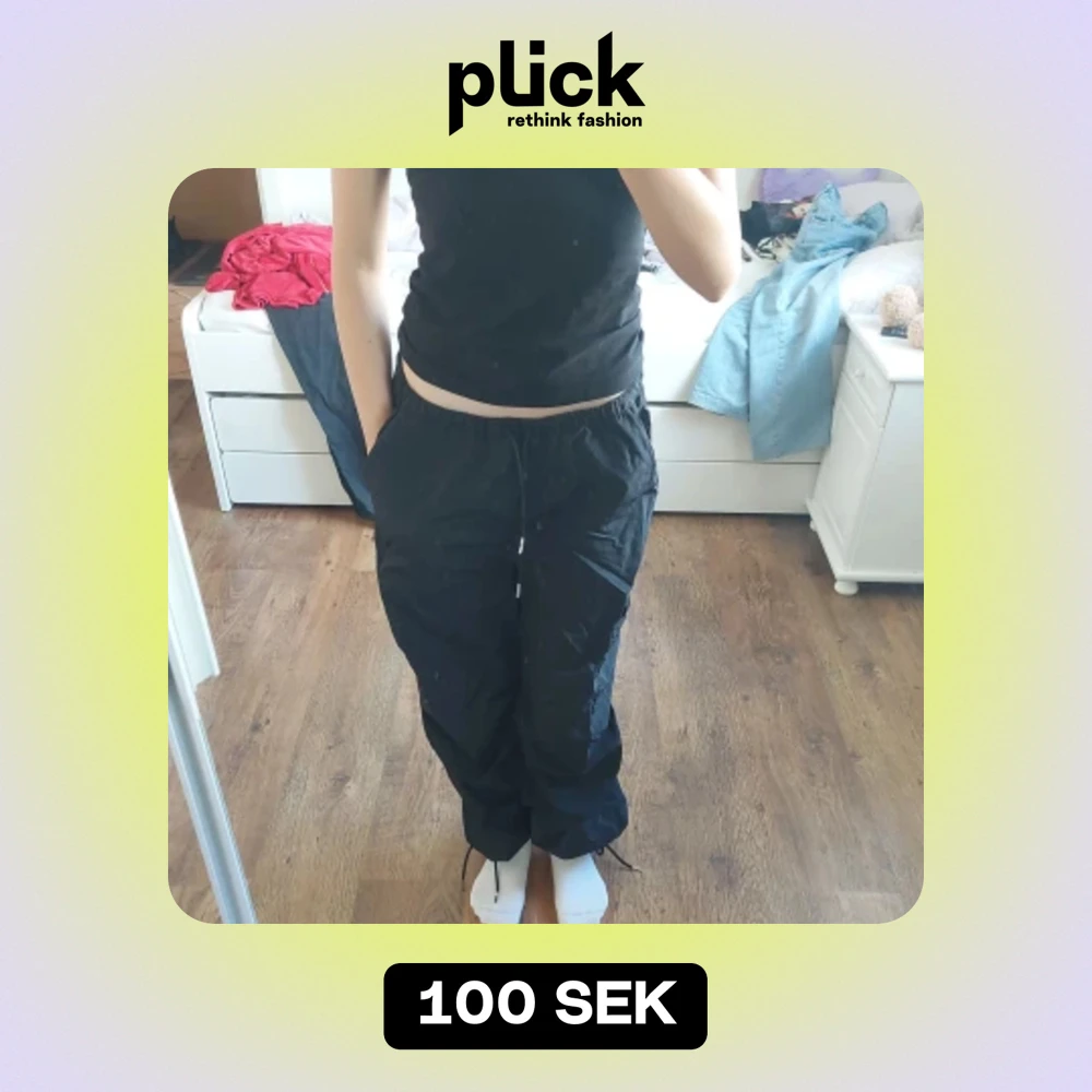 Cargobyxor i storlek xxs men är väldigt oversized så typ som en S/M 1 bakficka, 2 sidofickor på benen och 2 vanliga fickor, knytsnören nere vid bensluten och i midjan. Oanvända pga för stora.