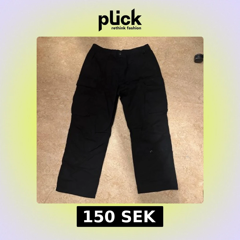 Säljer ett par svarta cargopants med praktiska fickor på sidorna. Byxorna har en loose passform och är perfekta för en avslappnad stil. Tillverkade i ett slitstarkt material som passar bra för olika aktiviteter. Använda 1 gång