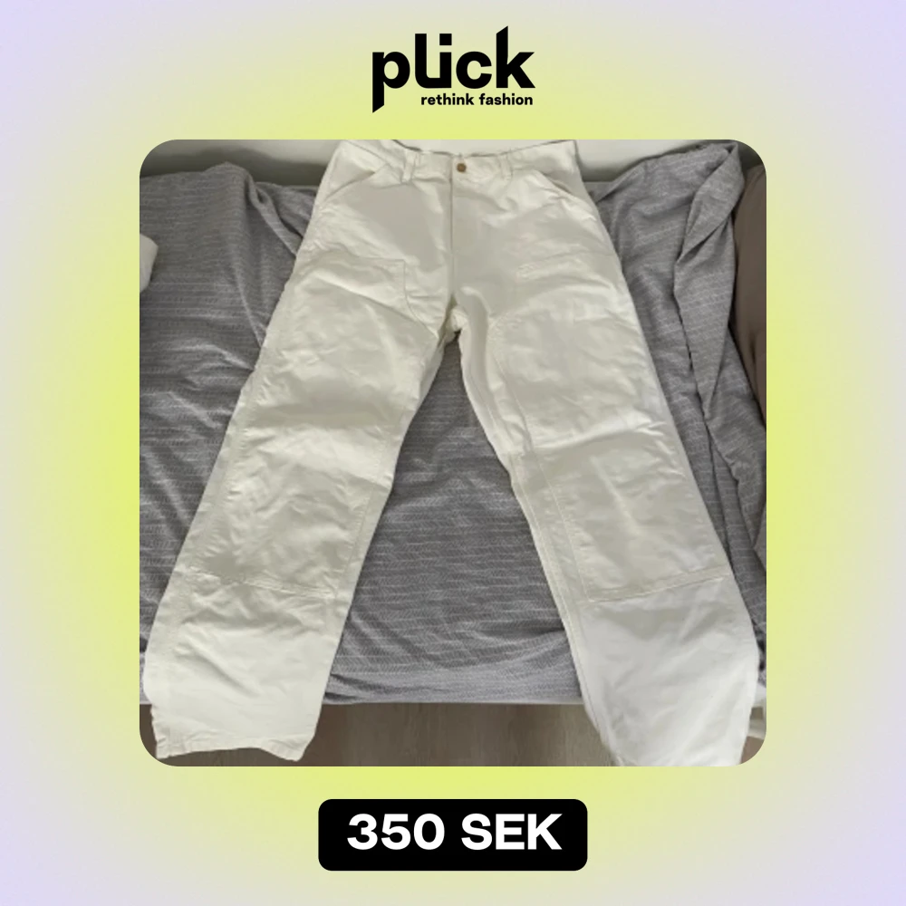 Ett par gräddvita Carharrt double knee jeans i väldigt bra skick. Knappt använda. Bara att skriva vid eventuella frågor! W34 L34