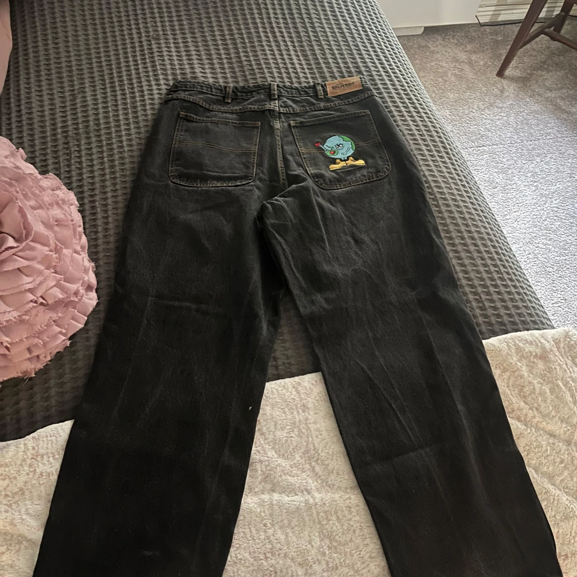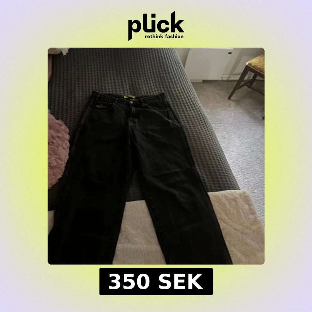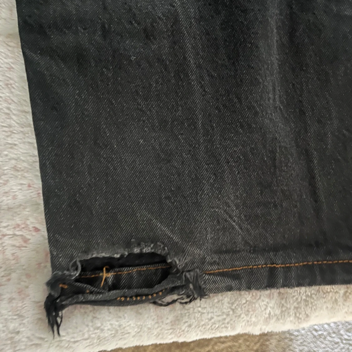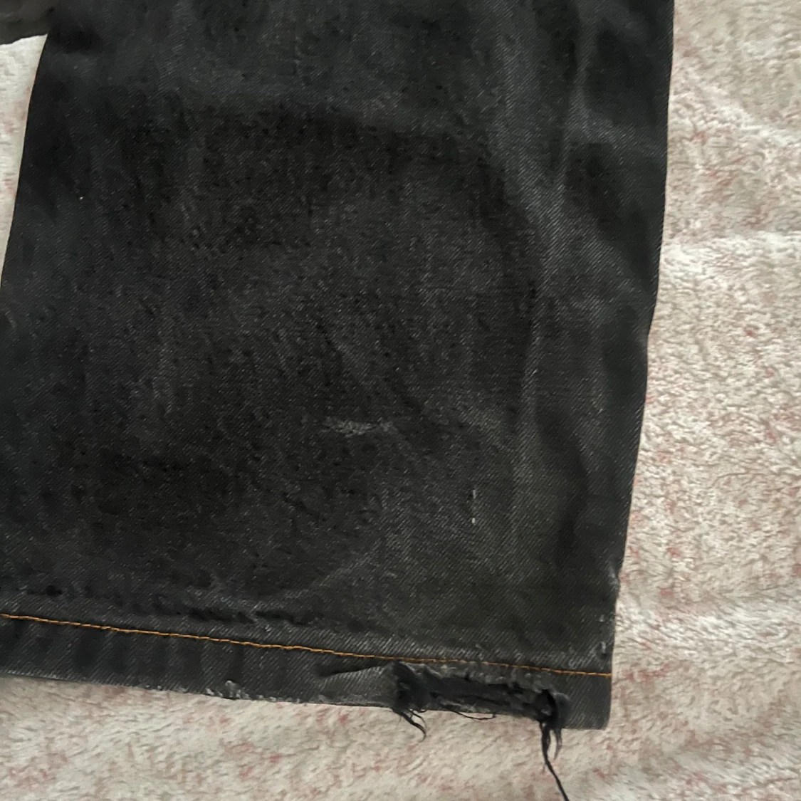 Säljer ett par svarta raka jeans från Butter med coolt broderi på bakfickan. Jeansen har klassisk femficksdesign och orange sömmar. Sönder längst ner vid fötterna. (Kolla bilderna)