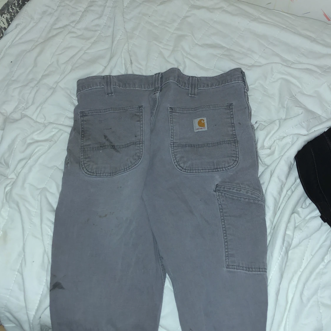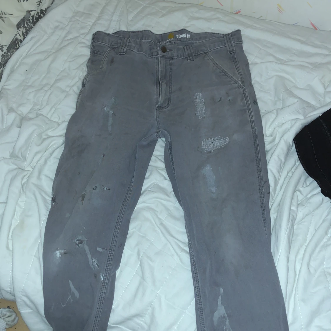Grå cargopants från Carhartt i relaxed fit med slitna detaljer och lagningar. Byxorna har stora bakfickor, extra benficka och klassisk Carhartt-logga på bakfickan. Perfekta för en avslappnad och streetig stil. Har dock vit färg pläckar, som kanske är möjligt att ta bort.