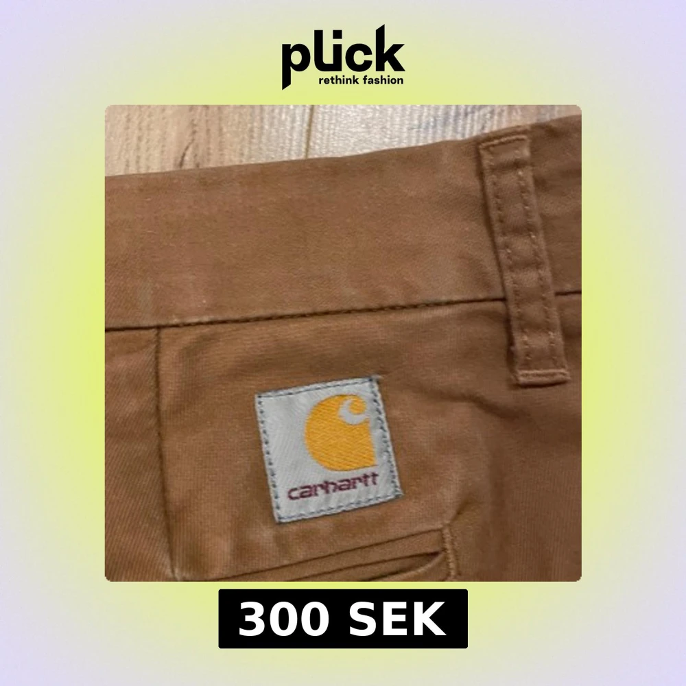 Säljer ett par bruna byxor från Carhartt. De har en klassisk design med en rak passform och är tillverkade i en slitstark bomullsblandning. Perfekta för en avslappnad stil.