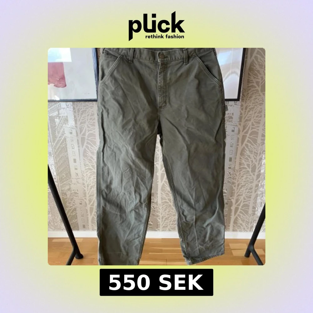 Säljer ett par gröna byxor från Carhartt i 100% bomull. Byxorna har en avslappnad passform med flera praktiska fickor och en klassisk design. Perfekta för en casual look.